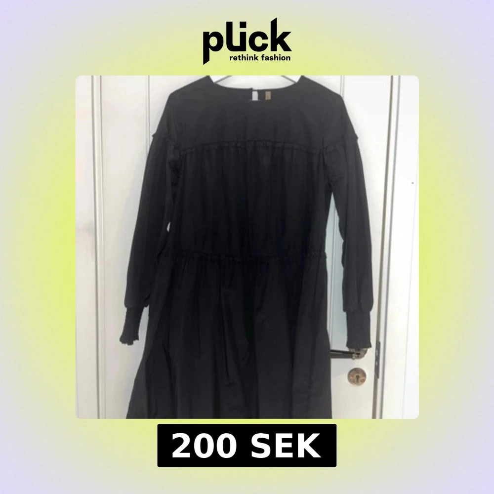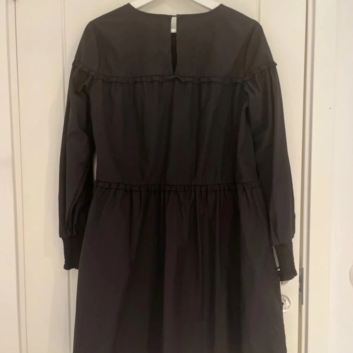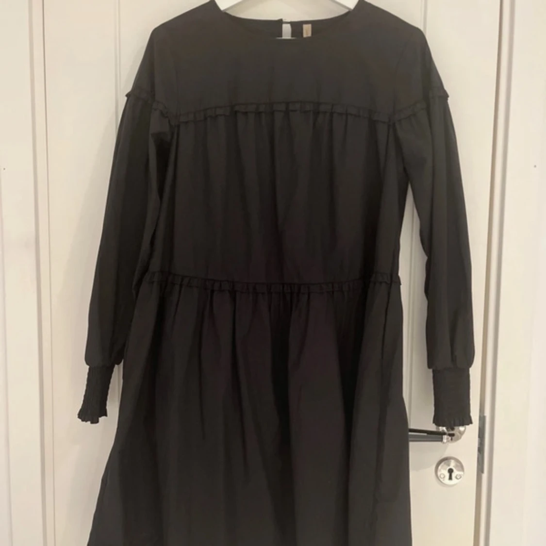 Elegant svart klänning med volangdetaljer och långa ärmar. Perfekt för en stilren look. Klänningen har en lös passform och är tillverkad i ett mjukt material.