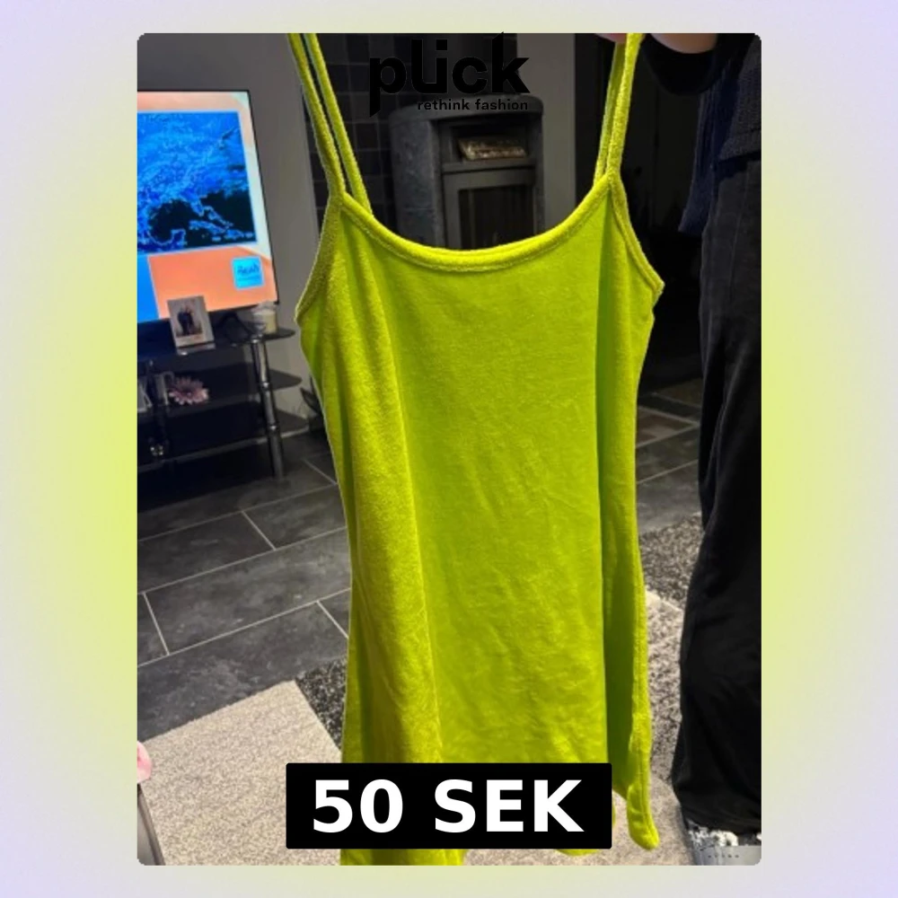 Säljer en limegrön kort klänning från Divided med smala axelband och enkel, rak passform. Klänningen är ärmlös och gjord i mjuk bomull, perfekt för varma dagar. Supersnygg att styla med sneakers eller sandaler!