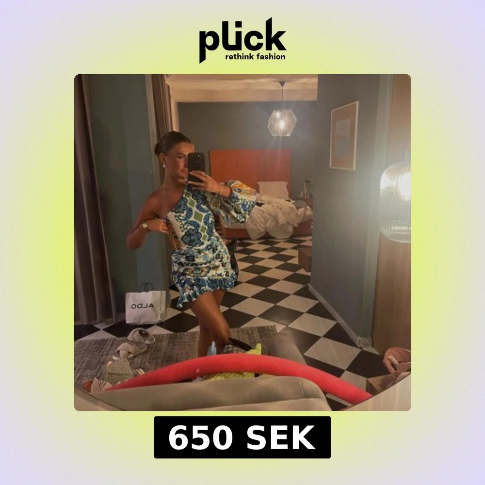 Superfin kortklänning med färgglatt blommönster i blått, grönt och orange. One shoulder-modell med lång ärm på ena sidan och volangdetalj nertill. Sitter tajt över kroppen. Linne blanding i storlek XS