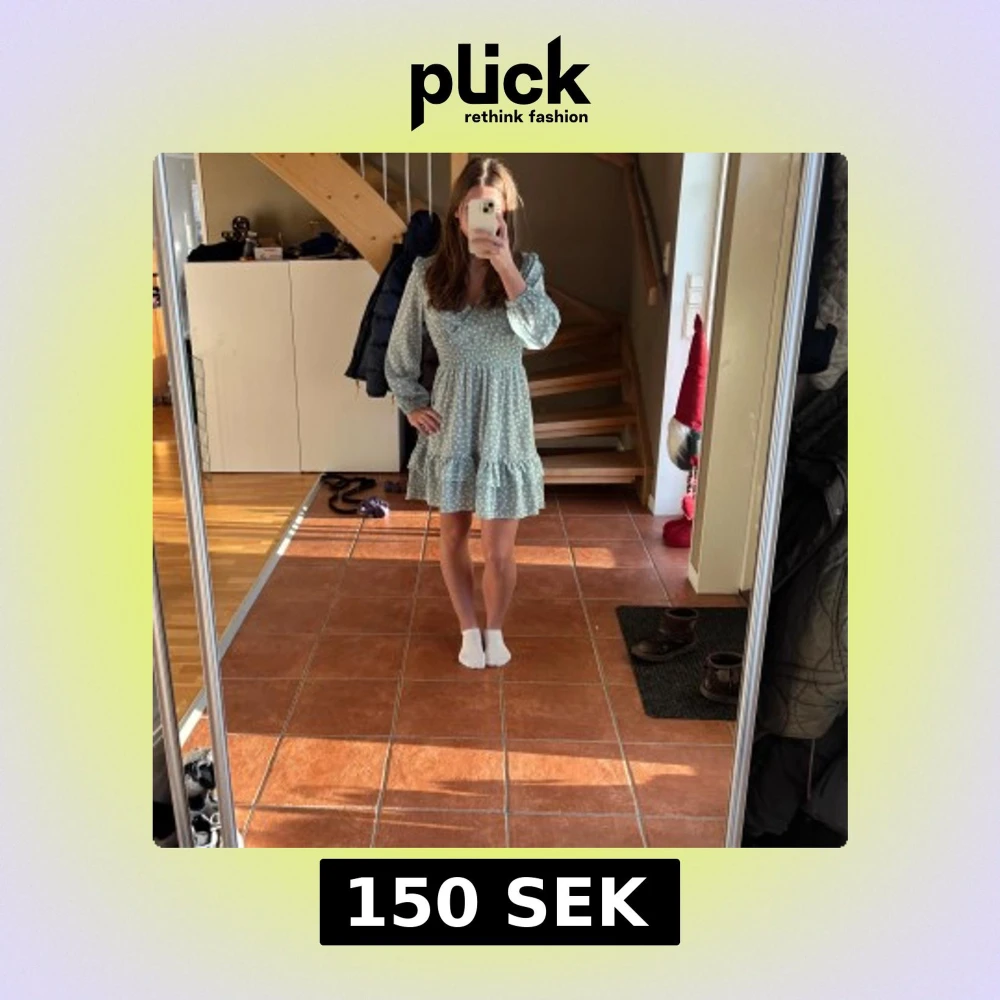 Säljer en söt ljusgrön klänning med vita prickar. Klänningen har långa ärmar och en volangdetalj nertill. Endast använd en gång.💕💕