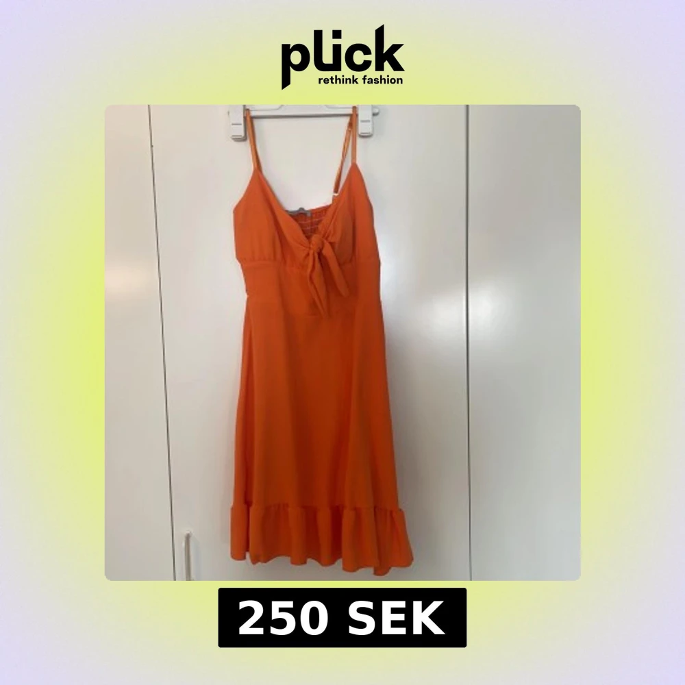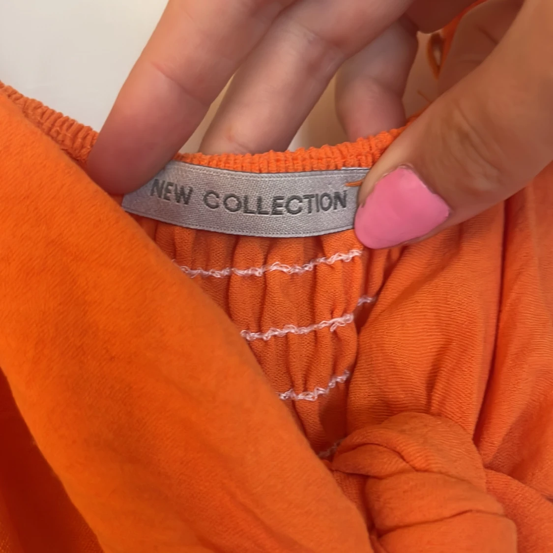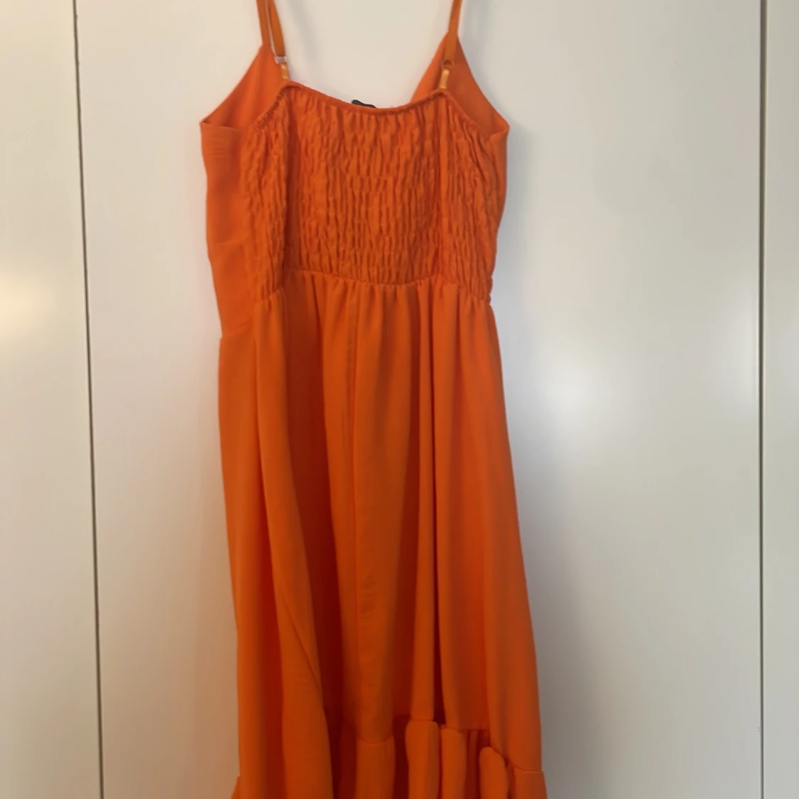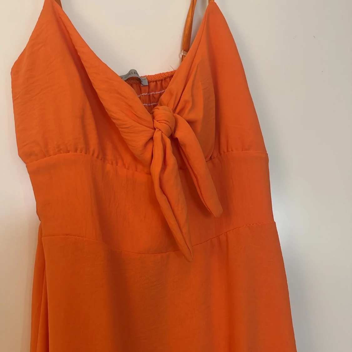 Superfin orange kortklänning från New Collection med smala axelband, knyt framtill och volangkant nertill. Perfekt för varma dagar, lätt och luftig med smockad rygg för extra komfort. Snygg och enkel att styla till sneakers eller sandaler. Klänningen har ett litet ilägg i Bh delen.