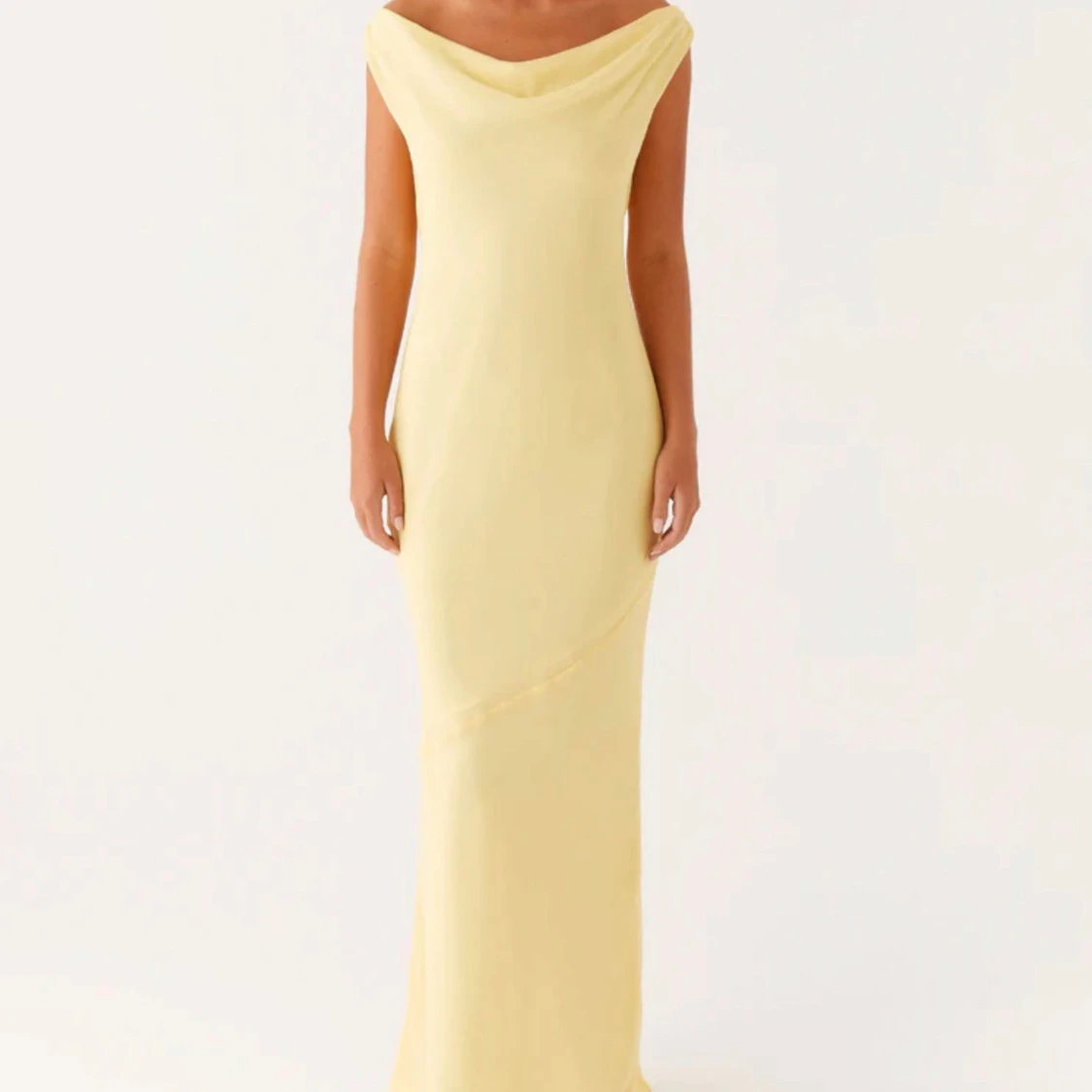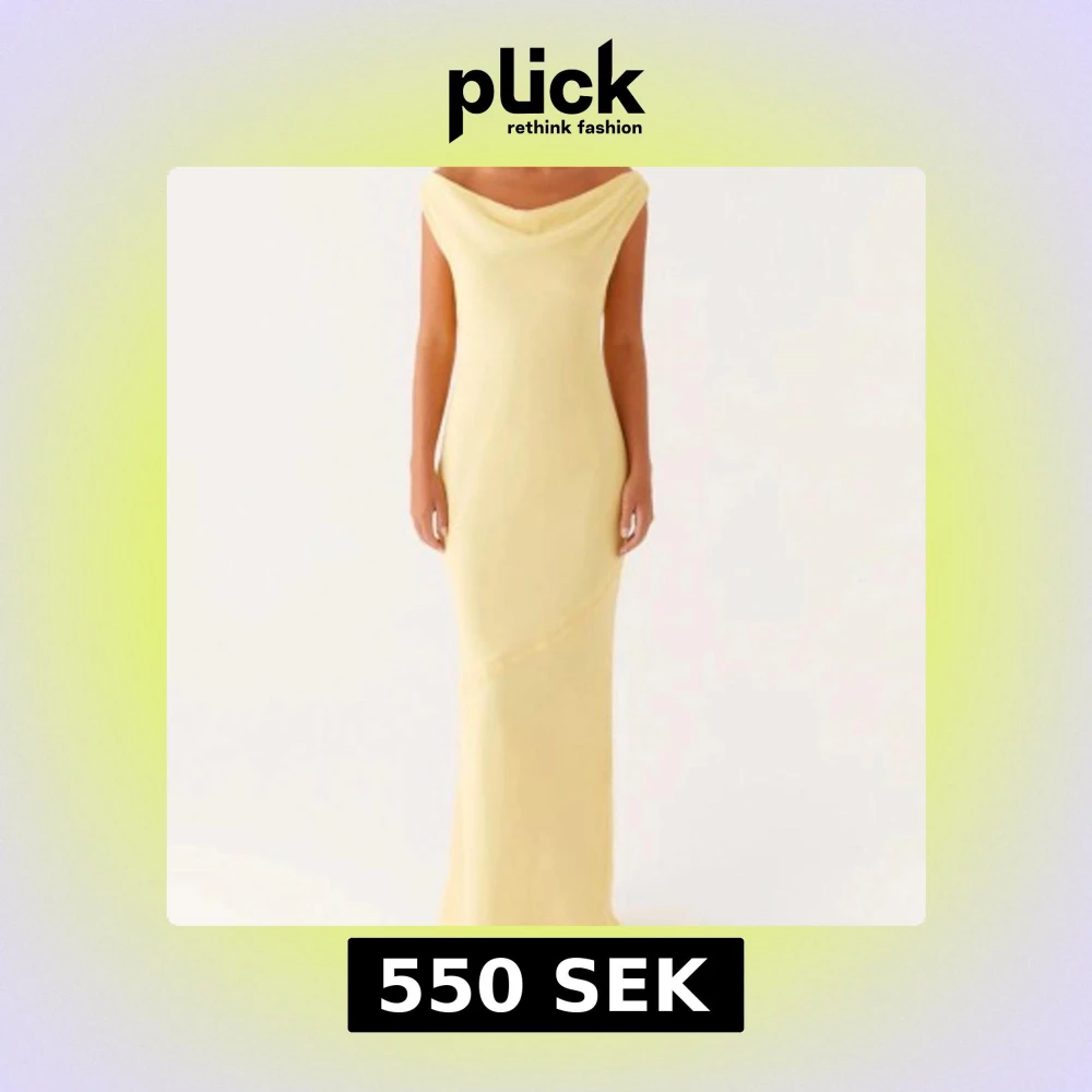 Peppermayo klänning  - Superfin ljusgul långklänning med offshoulder och snygg öppen rygg med knyt. Klänningen har en elegant, figurnära passform och är tillverkad i ett glansigt, mjukt material som faller snyggt. Perfekt för dig som vill sticka ut med en fräsch och somrig look.