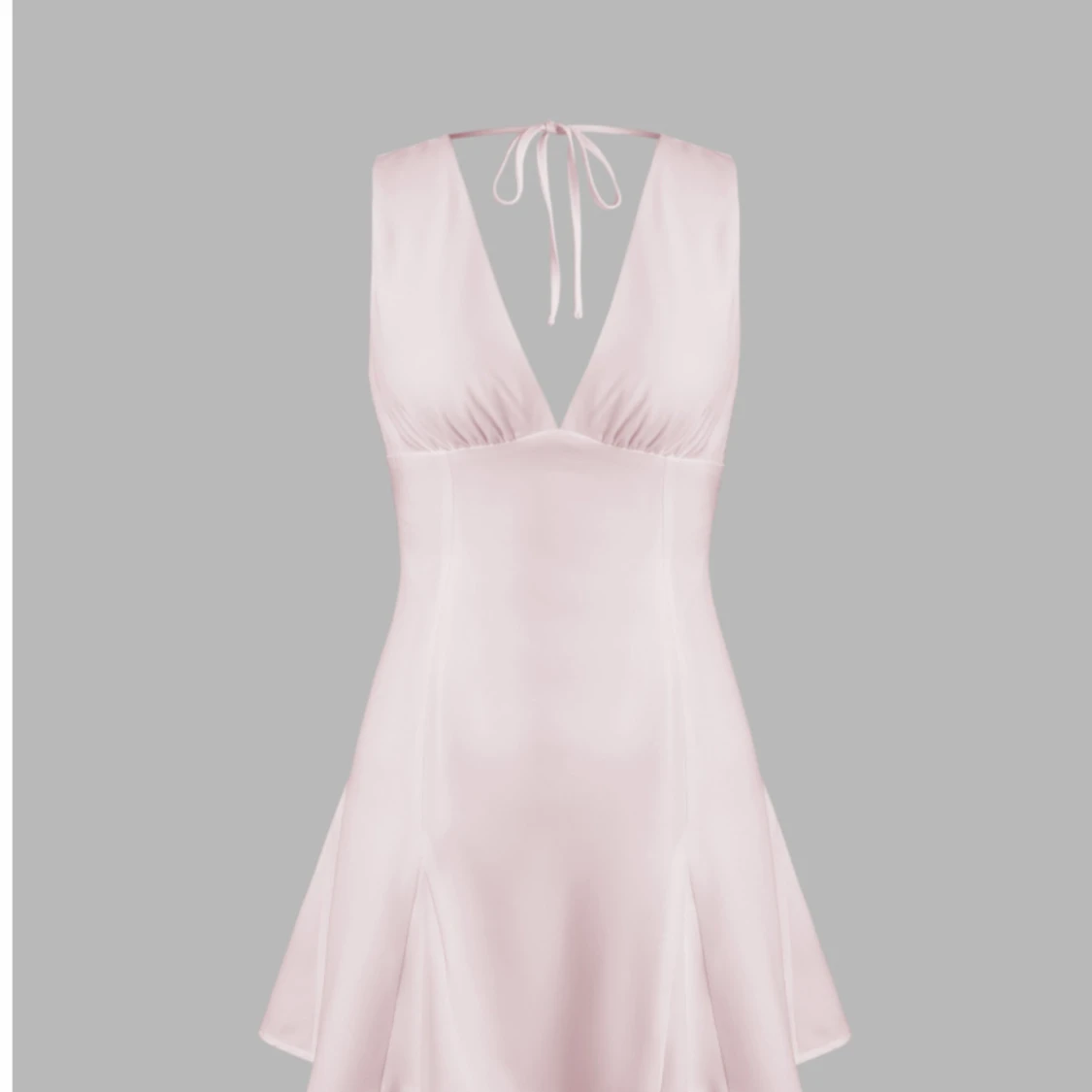 Supersöt ljusrosa kortklänning i satin med v-ringning och knyt i nacken. Klänningen har en lätt utsvängd kjol och är ärmlös, perfekt för sommarkvällar eller när du vill känna dig extra fin.