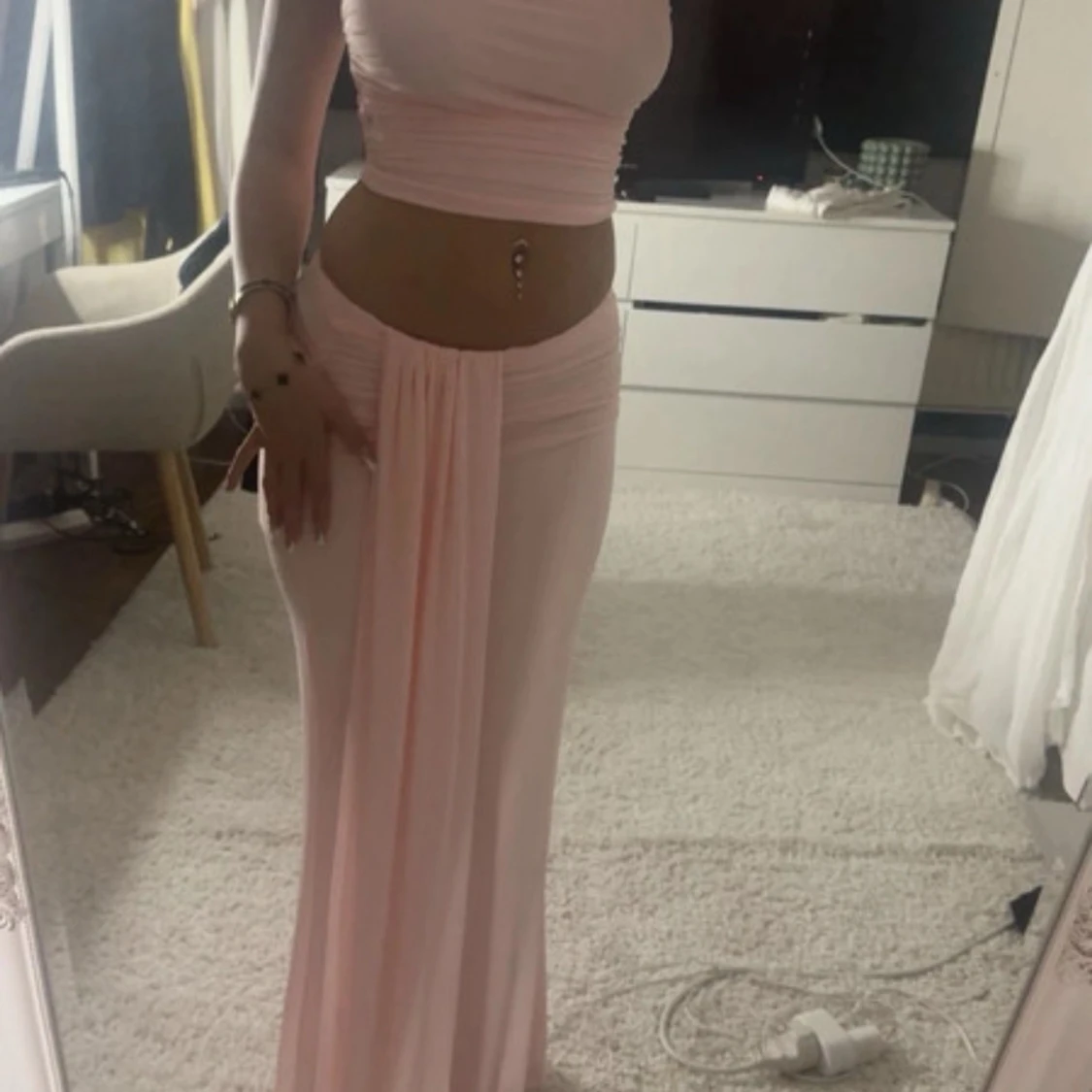 Supersnygg ljusrosa långkjol med bandeau-topp och figurnära passform. Settet har en draperad detalj framtill i midjan och är axelbandslös, vilket ger en clean och modern look. Perfekt för dig som vill sticka ut med en feminin och trendig stil.