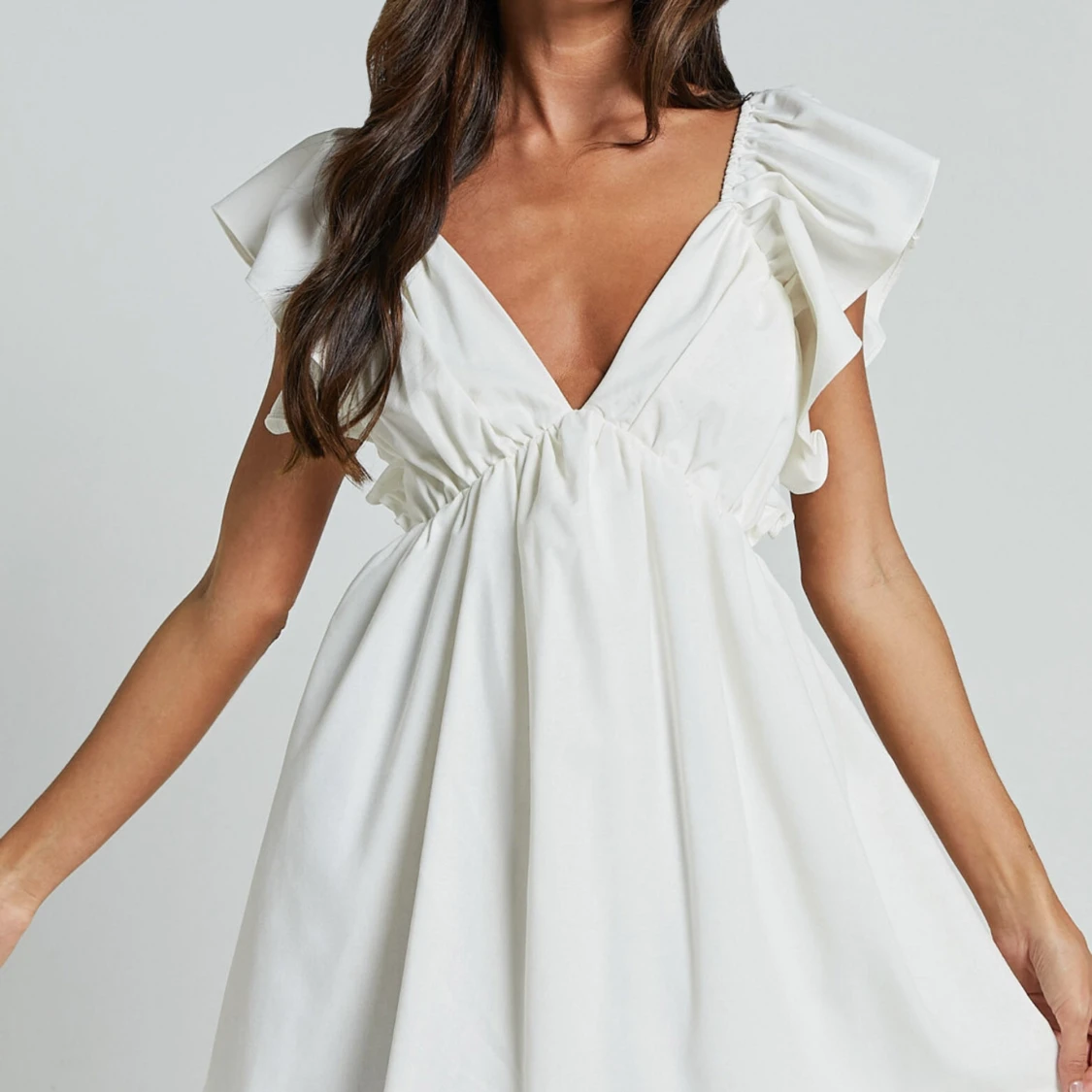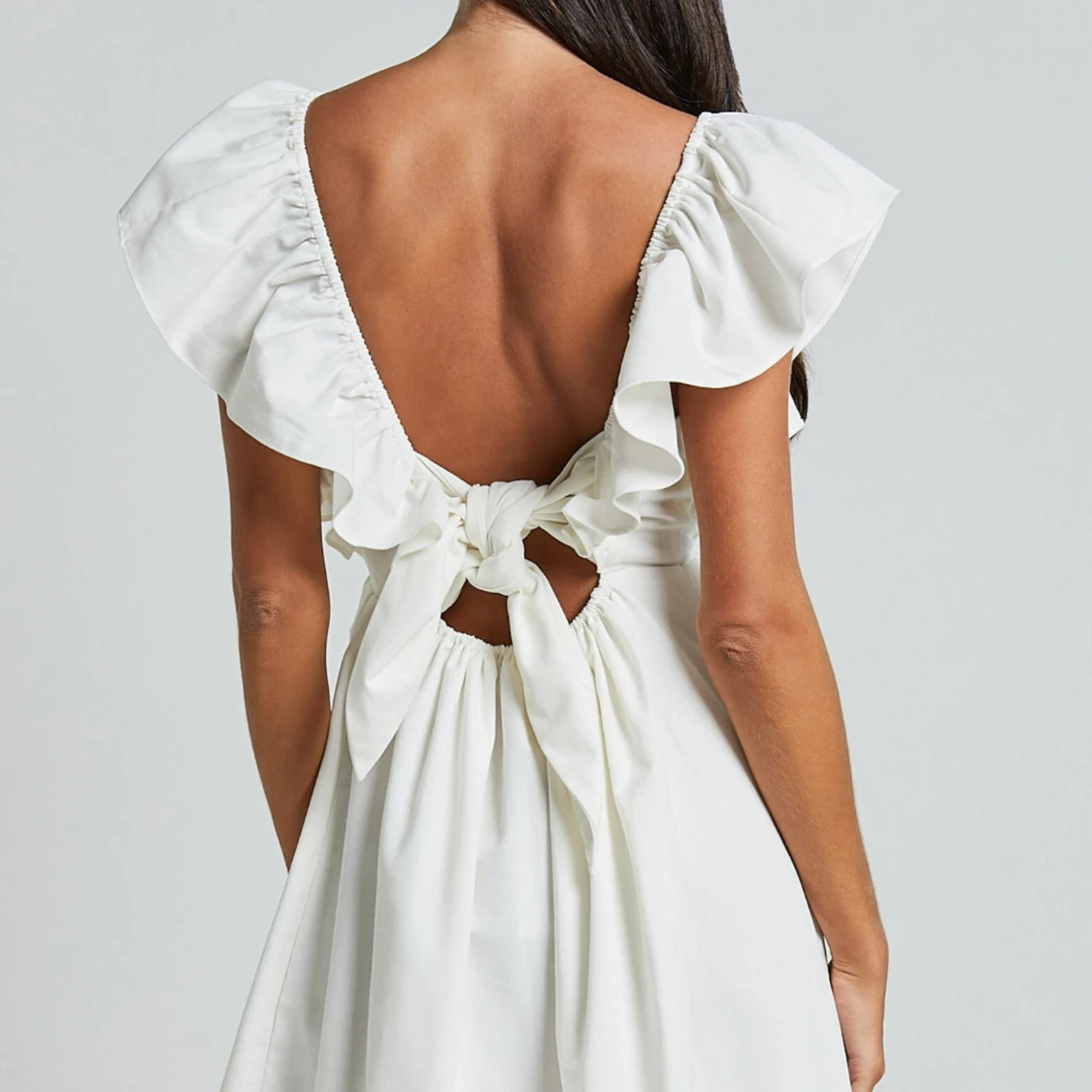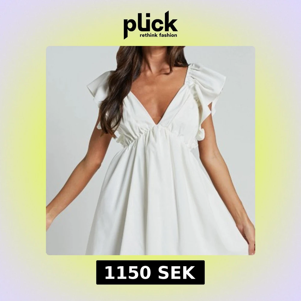 Elegant vit klänning med v-ringad fram och öppen rygg. Klänningen har volangdetaljer vid axlarna och en knytning i ryggen. Perfekt för sommarens festligheter. Stl S ifrån showpo, endast testad med prislapp kvar💕