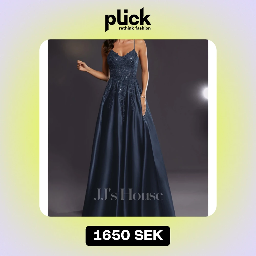 mörkblå balklänning med glittriga detaljer. öppen rygg med snörning. Jag är 160 men var alldeles för kort så vek upp den men passar alla upp till 175 typ. Sen kan man välja storlek med knytningen i ryggen så passar 34-40 skulle jag säga. Köpte för 2,400 på jj house plus 550kr frakt. 💙det finns två under tyg och nätet som finns under har jag klippt upp för att man lättare ska kunna gå i den. Men inget som syns eller störs