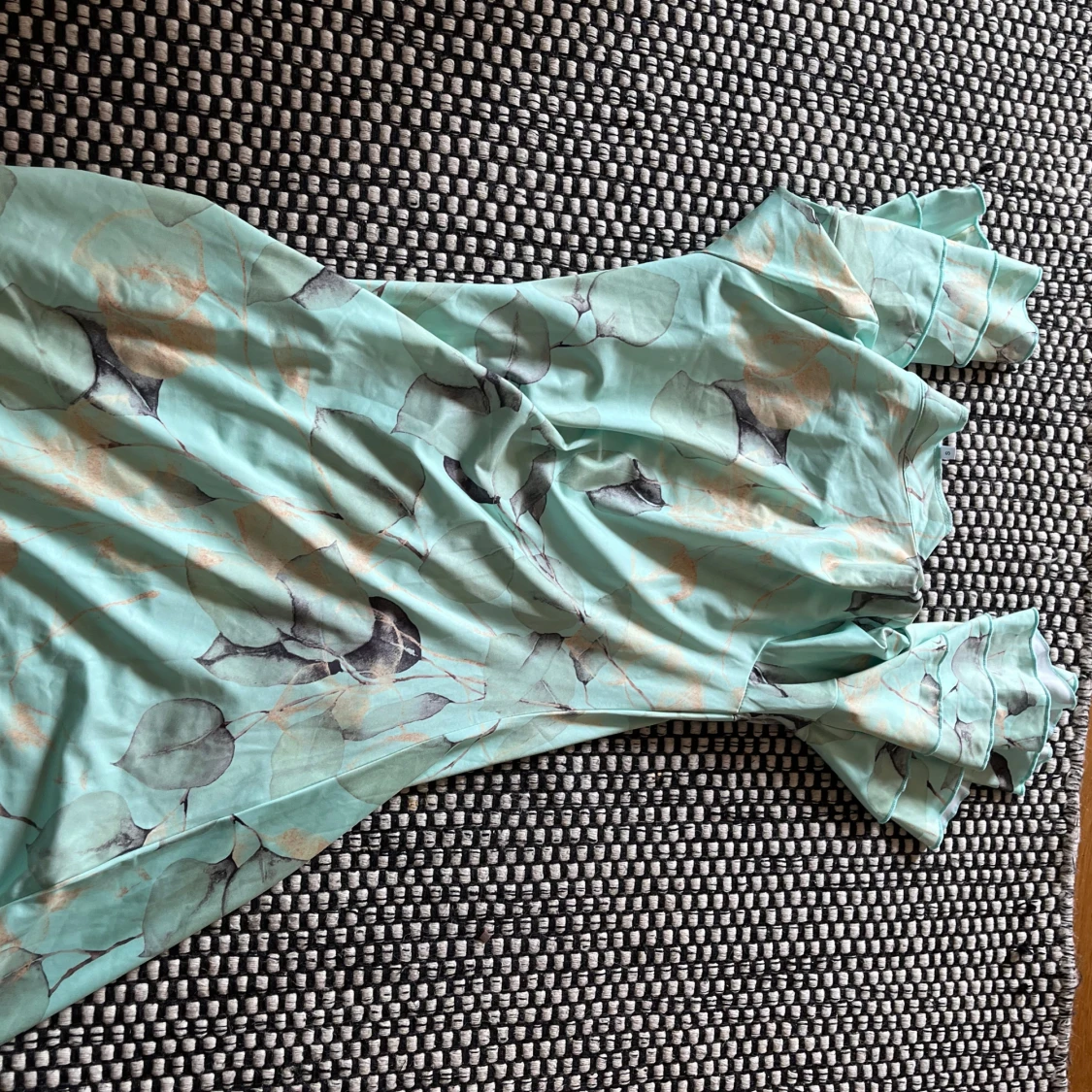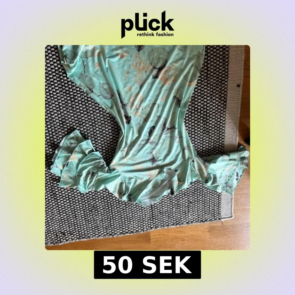 Superfin mintgrön långklänning med blommigt mönster i ljusa och grå toner. Klänningen har volangdetaljer vid ärmarna och en figurnära passform som ger en snygg siluett. Perfekt för dig som gillar romantiska och somriga vibes.