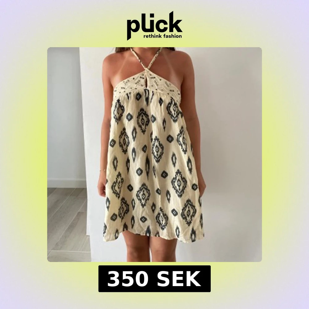 Säljer en beige kortklänning med svart mönster och broderad överdel. Klänningens axelband korsar fint på baksidan🤍