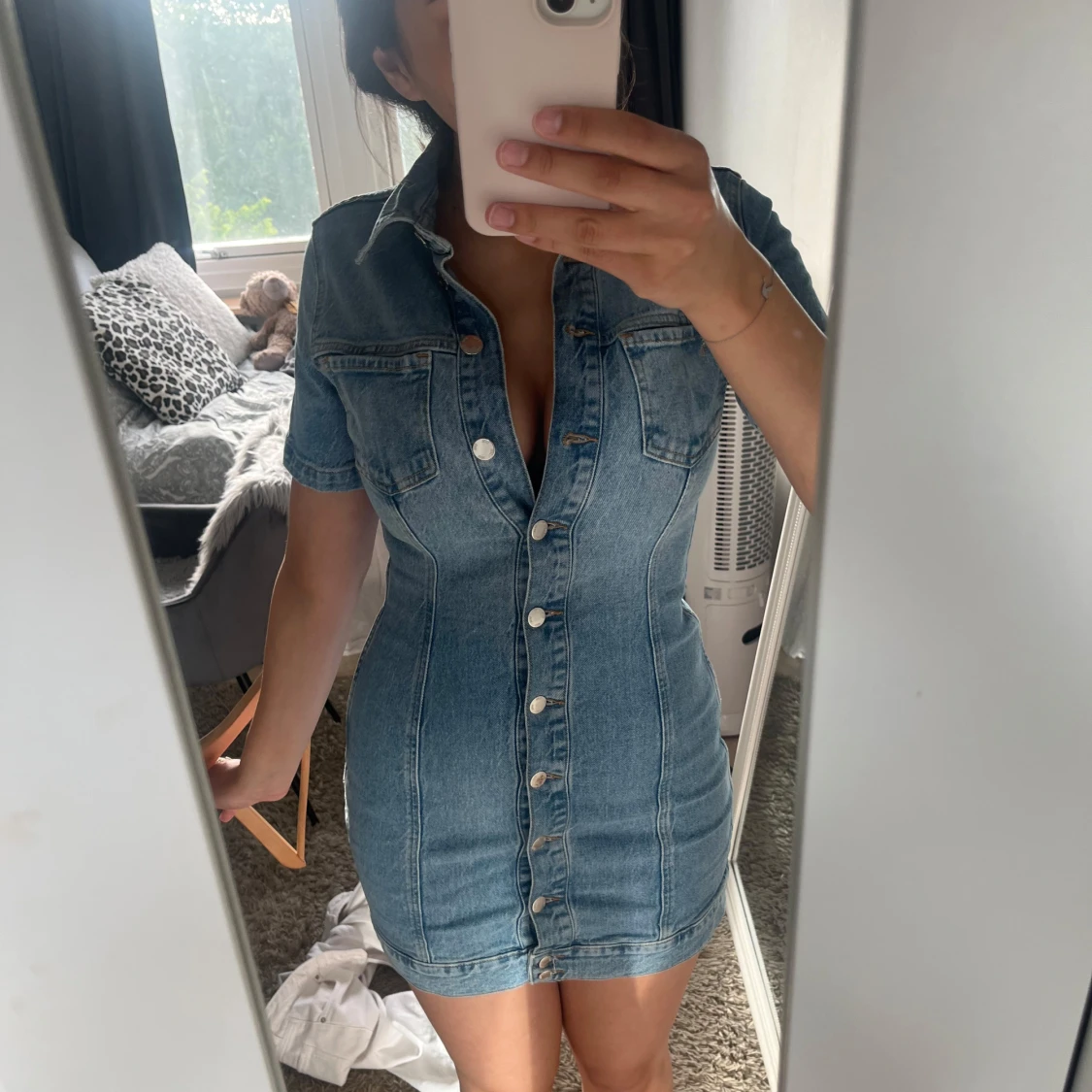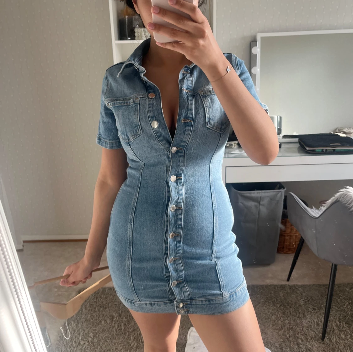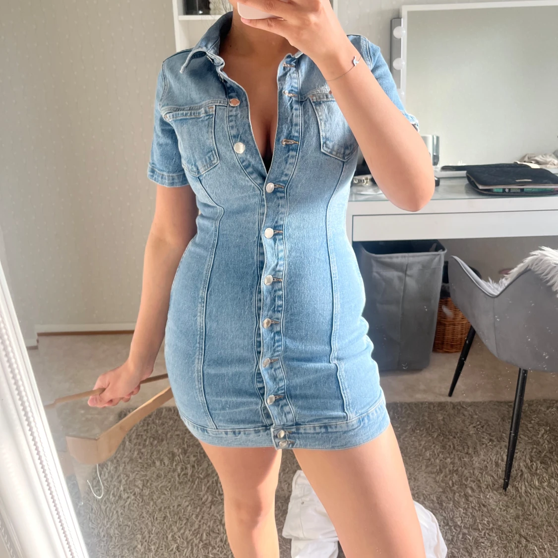 Säljer en snygg kort jeansklänning med krage och korta ärmar. Klänningen har knappar hela vägen framtill och två bröstfickor. Figurnära passform som framhäver siluetten. Oanvänd och väldigt bra skick!🥰