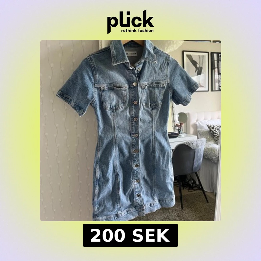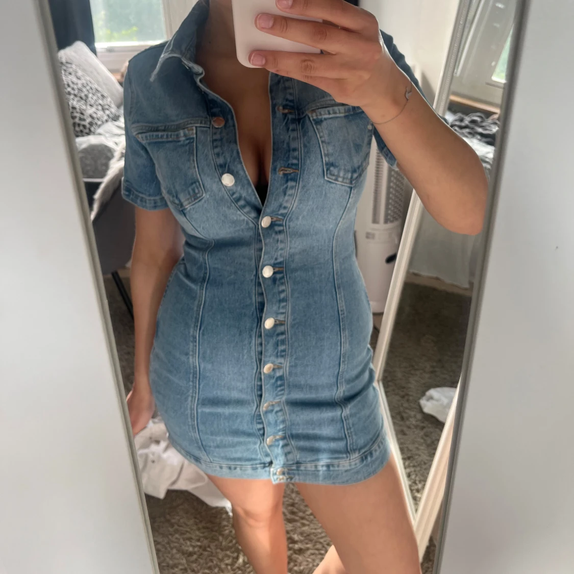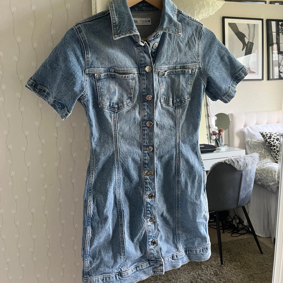 Säljer en snygg kort jeansklänning med krage och korta ärmar. Klänningen har knappar hela vägen framtill och två bröstfickor. Figurnära passform som framhäver siluetten. Oanvänd och väldigt bra skick!🥰