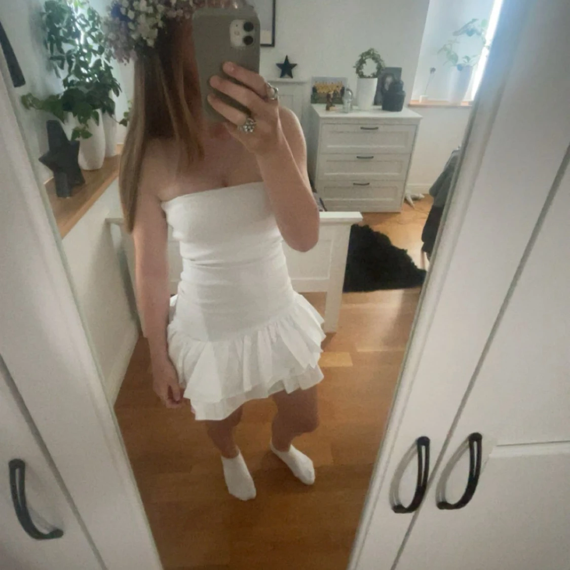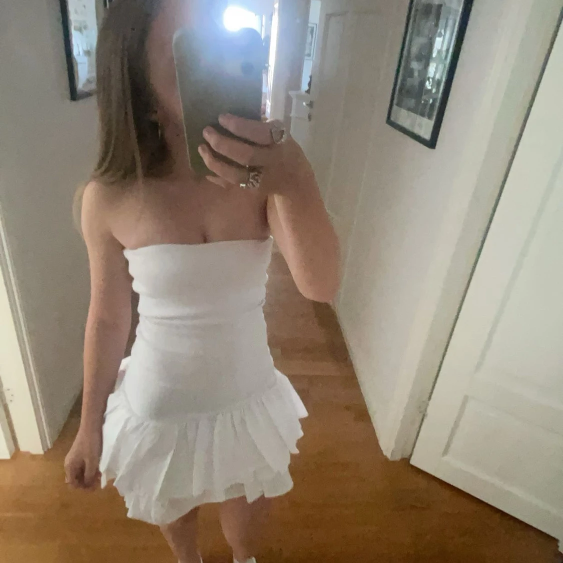 Supersöt vit axelbandslös kortklänning från Zara str S. Använd 1 gång på midsommar förra året! Säljer för att den ej kommer till användning.