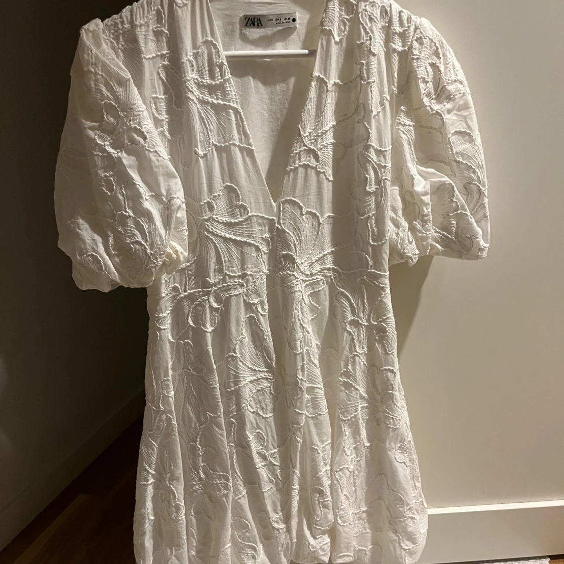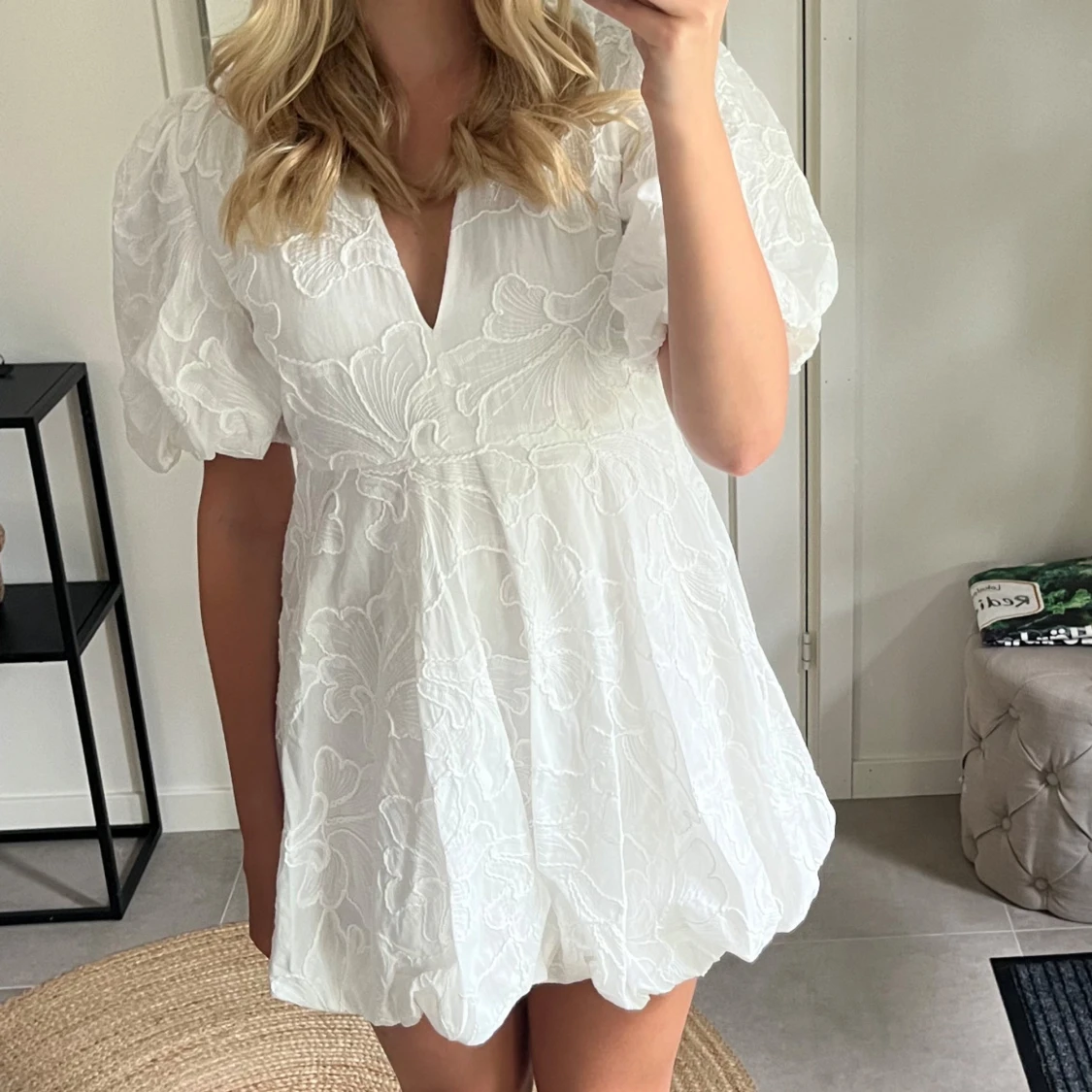 Säljer en söt vit klänning från Zara med puffiga korta ärmar och v-ringning. Hade som en av mina studentklänningar. Den va perfekt!! Inga fläckar som syns. Sista bilden syns lite smink vid axeln men absolut inget märkbart.
