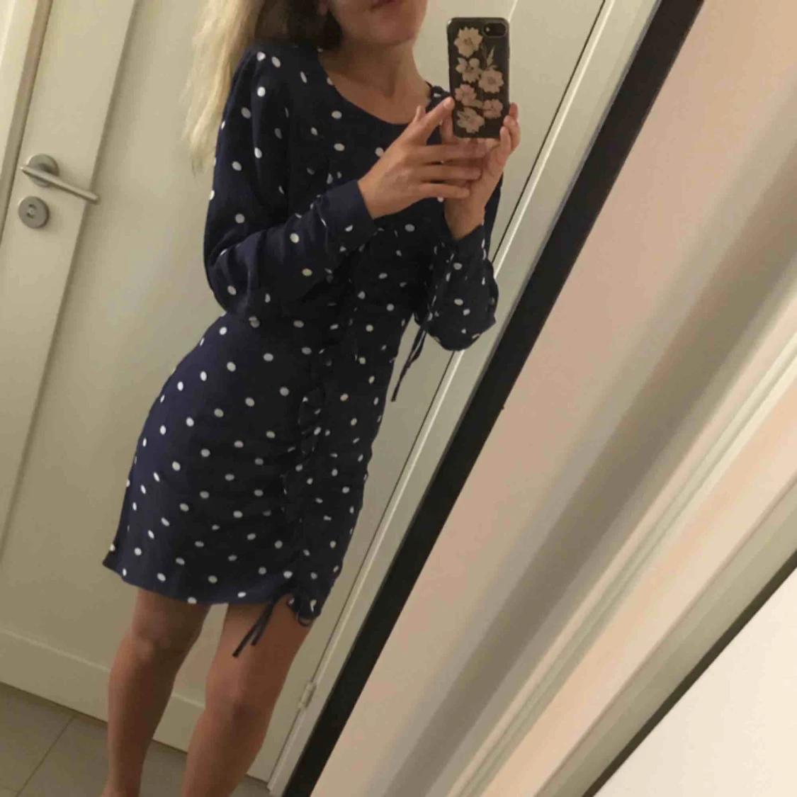 Blå vit prickig klänning med små axelvaddar och dragkedja där bak. Det finns knytning så att man själv kan reglera hur den ska sitta. Swish. Köparen står för frakt