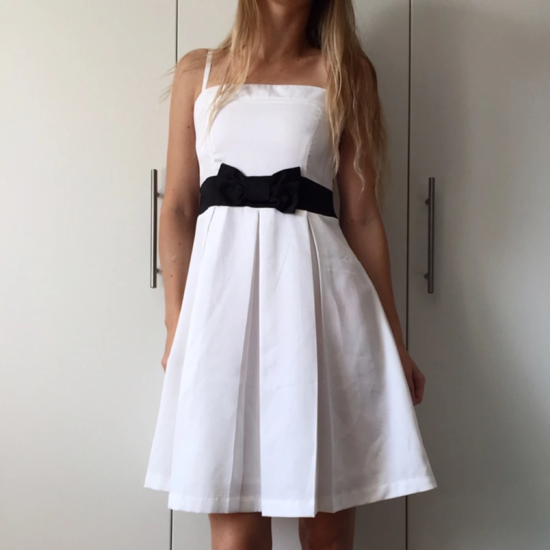 Klänning från Zoul, MQ, storlek 34. Superfin till studenten eller sommarfesten. Endast använd 1 gång, som ny. Vit med svart band samt rosett framtill, reglerbara axelband.