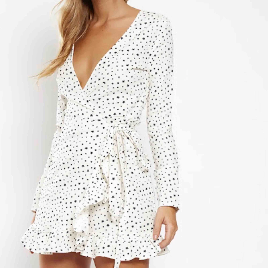 En jättefin wrapdress med mörkblåa stjärnor från ett australiensiskt klädmärke! Aldrig använd pga att den är för liten för mig, jag är 168 cm och den är för kort för mig! Nypris var ca 550 kr! Frakt tillkommer 💫💫💫