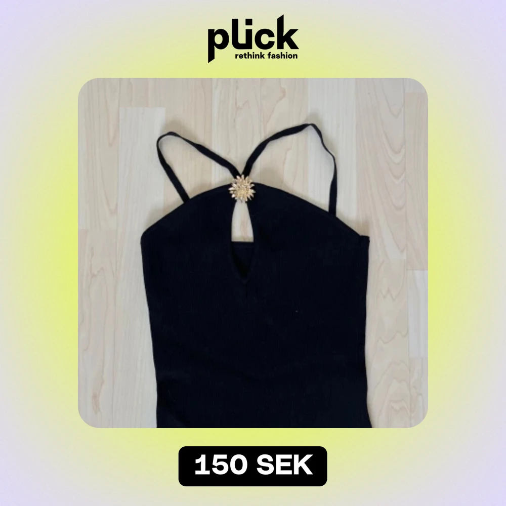Ribbad klänning med guld detalj. Figursydd med slits ✨
