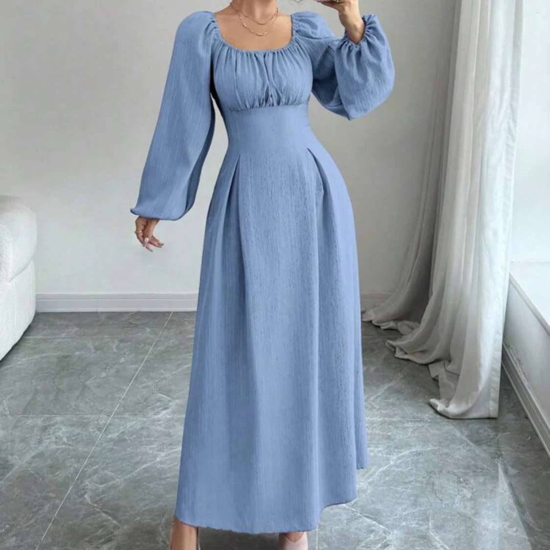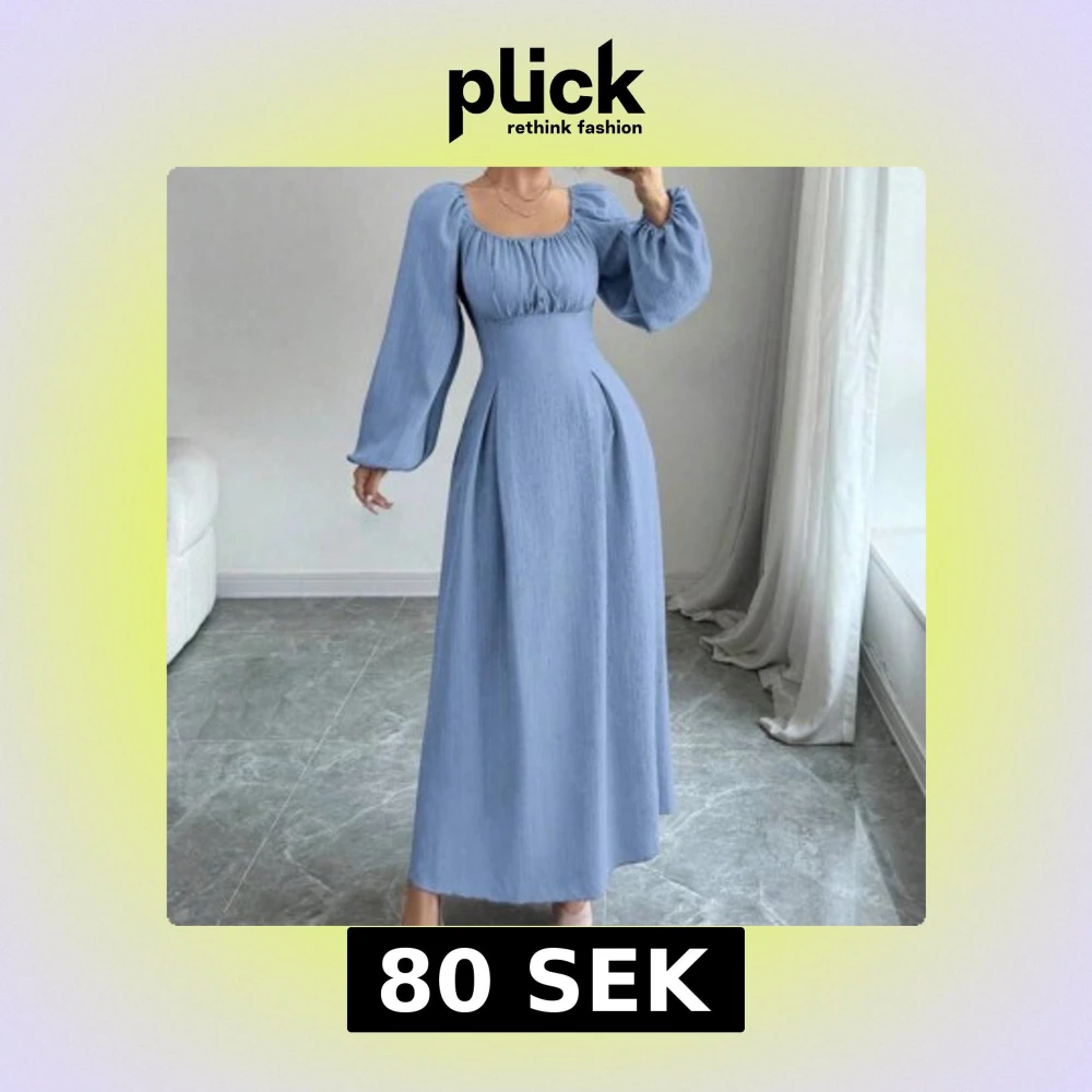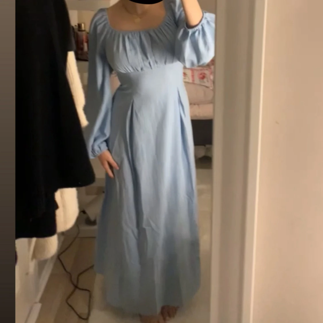 Superfin ljusblå långklänning med puffiga långärmar och fyrkantig ringning. Klänningen har en snygg snörning i ryggen som markerar midjan. Aldrig använd 🤍