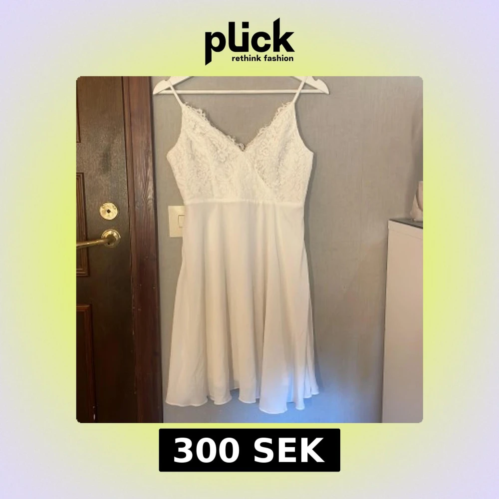 Superfin vit kortklänning med spets upptill och v-ringad hals. Tunna axelband och omlottknytning i ryggen. Jättebra skick då jag använt den två gånger