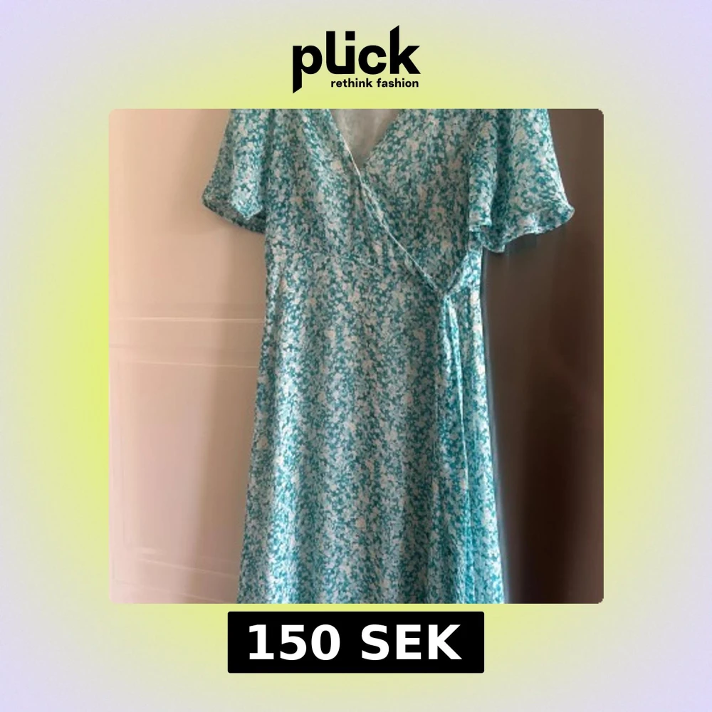Säljer en söt blå och vit blommig omlottklänning med korta ärmar och v-ringning. Klänningen har ett knyt i midjan och ett luftigt, somrigt tyg som passar perfekt till varma dagar.