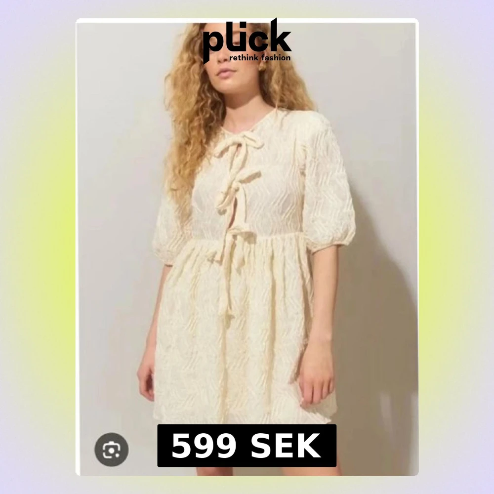 Supersöt kort klänning i ljus färg med strukturmönster och puffärmar. Klänningen har två dekorativa knyt framtill och lätt volang i kjolen. Perfekt för sommarens alla tillfällen och ger en romantisk vibe.