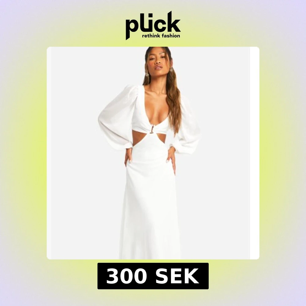 Elegant vit långklänning med djup v-ringning och ballongärmar. Klänningen har en stilren design med utskärningar i midjan och en dekorativ ringdetalj framtill. Perfekt för en chic och modern look.