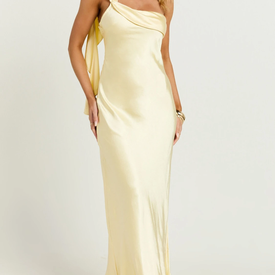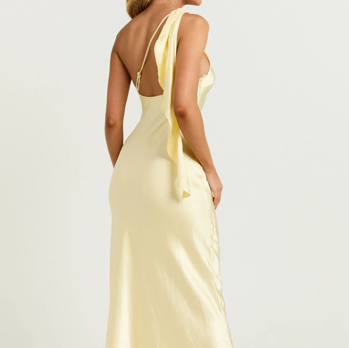 En super fin gul satin klänning med axelbandslös design och en vacker drapering över axeln. Perfekt för speciella tillfällen som t.ex bal eller bröllop. Aldrig använd med prislapp kvar