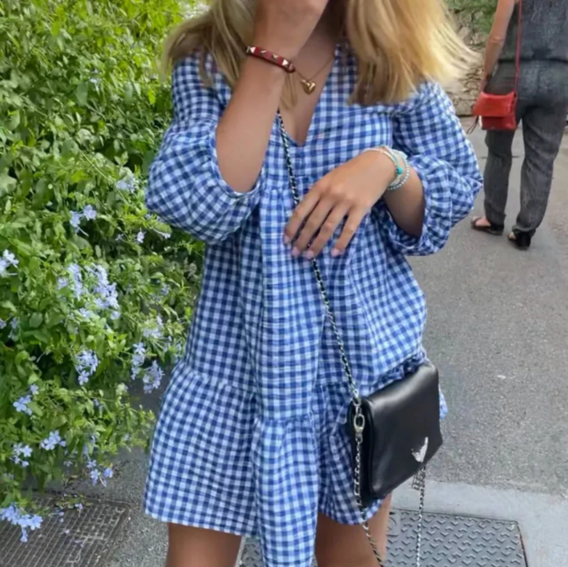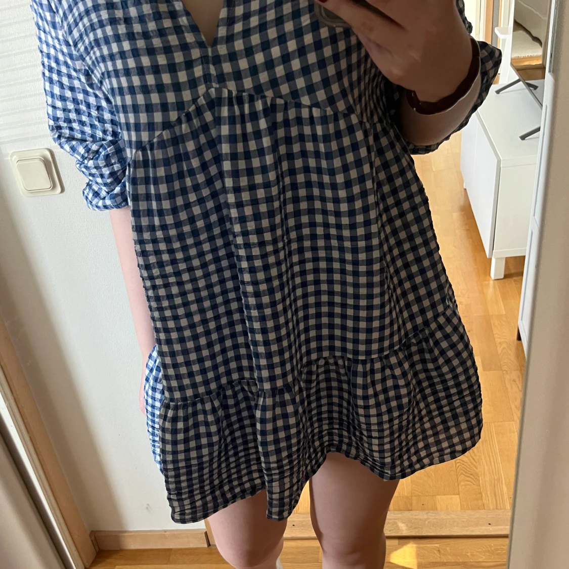Oanvänd blårutig klänning från Zara. Andra bilden är min egen första är lånad.