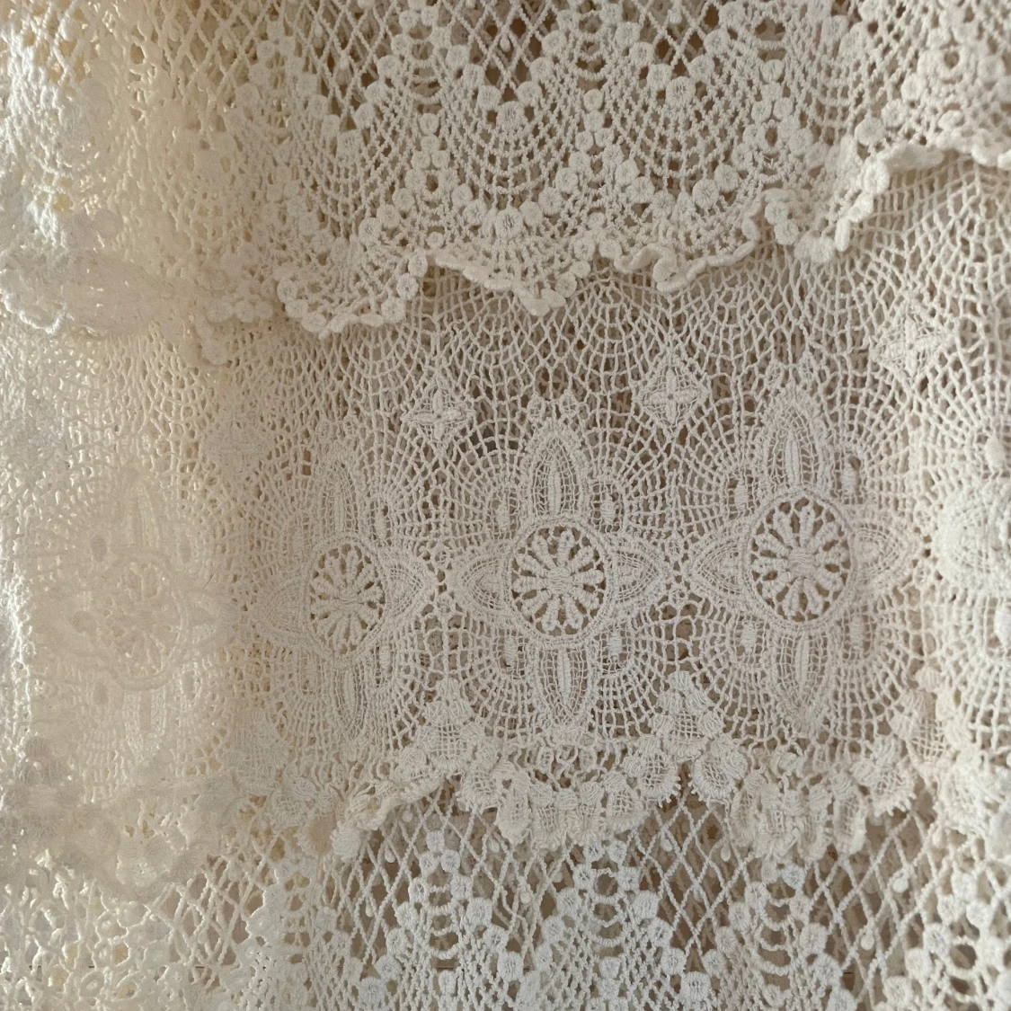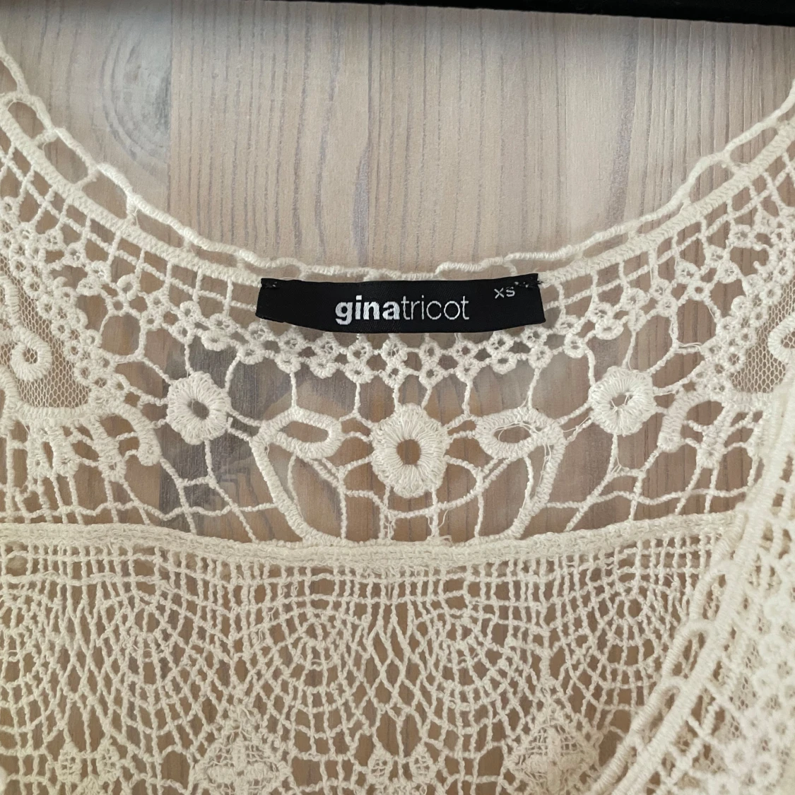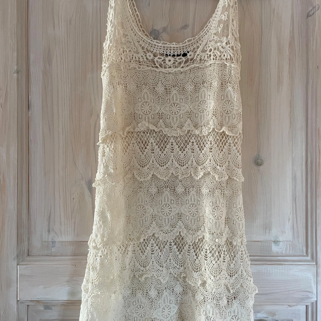Supersöt vit stickad vit klänning från Gina Tricot i storlek XS. Klänningen har flera lager med detaljerad spets och ett romantiskt mönster. Perfekt för sommarens alla tillfällen!