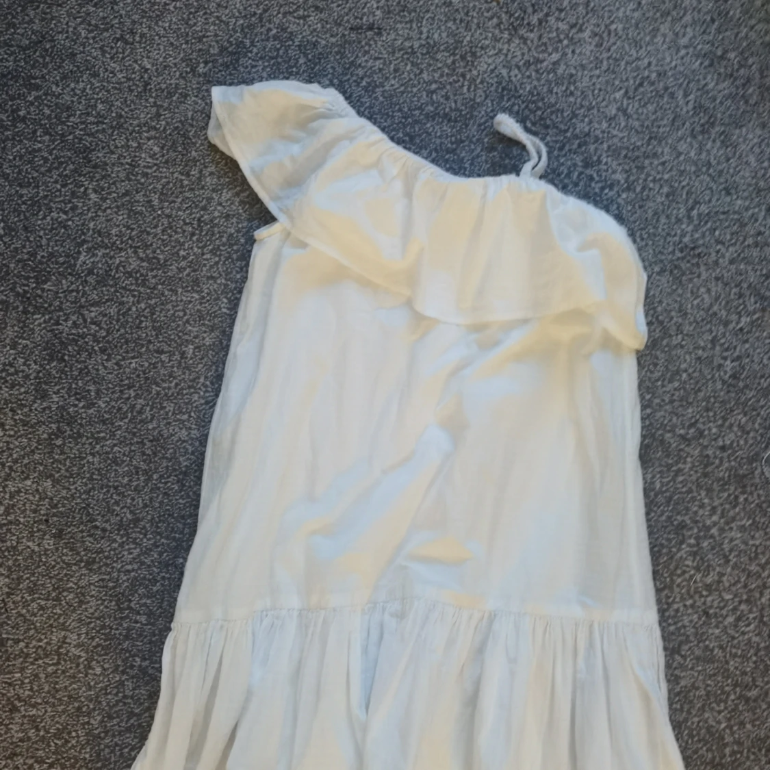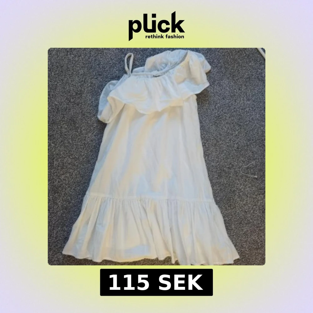Superfin vit kortklänning från Kappahl i bomull. Klänningen har offshoulder-design med volang upptill och en axelrem, samt en volangkant nertill. Har använts 3 gånger så nästan i helt nytt skick och inte de minsta tecken på användning 💓