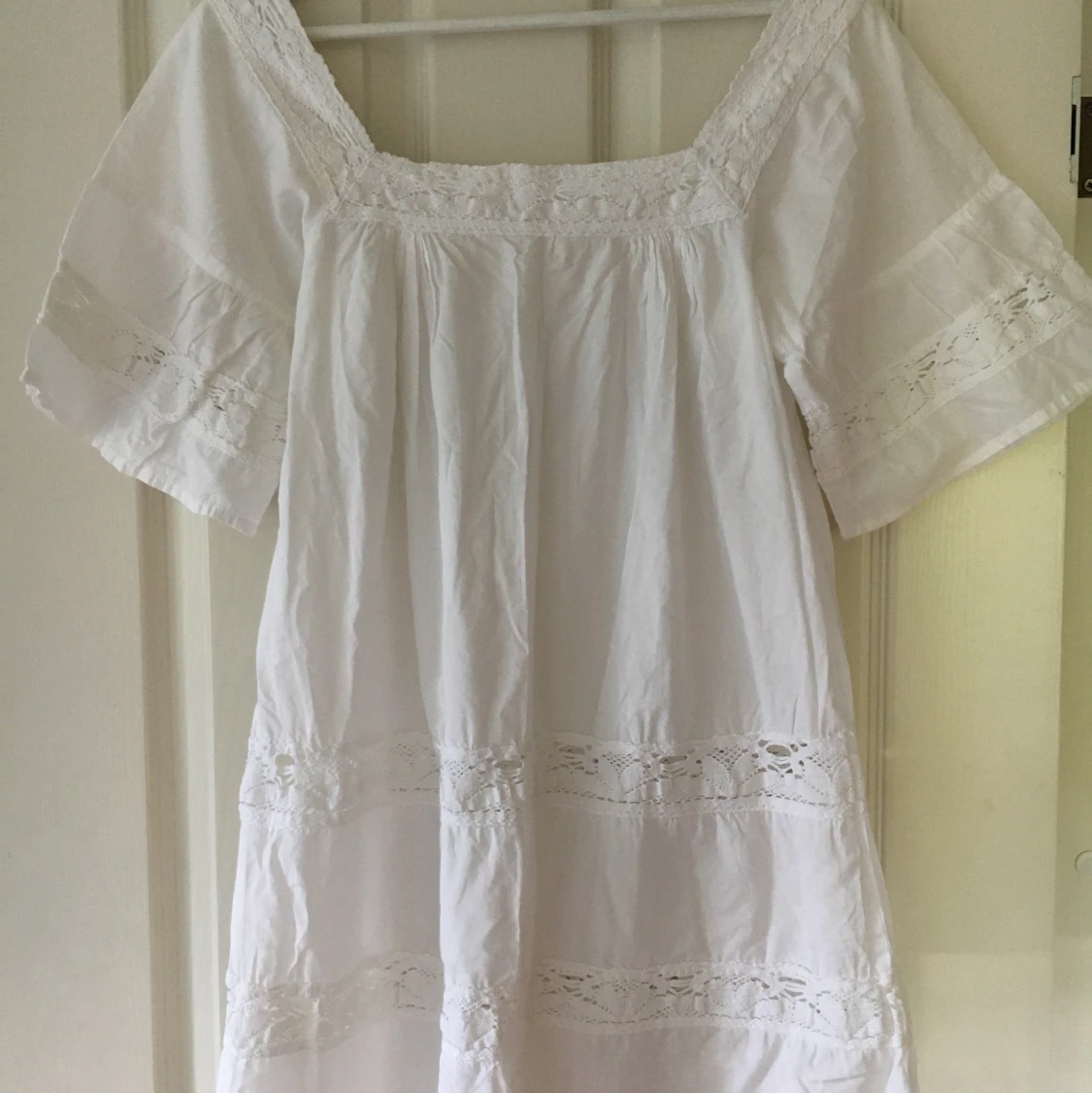 Supergullig vit klänning med virkade spetsdetaljer. Storlek M, men passar även för S. Är likadan på baksidan som framsidan. Kan mötas upp i Lund, eller skicka via post (frakt tillkommer då)☺️