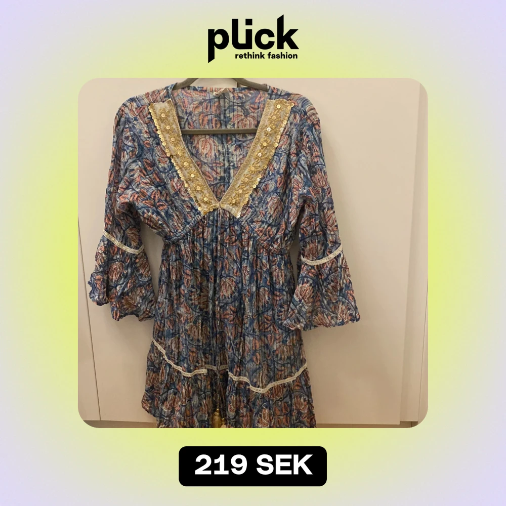 Säljer en superfin blommig klänning i blått och rosa med v-ringad spetskant och gulddetaljer. Den har trekvartsärmar med volang och en lös passform. Perfekt för sommarens fester eller en dag på stan. Klänningen har också dekorativa tofsar framtill. 🌸✨