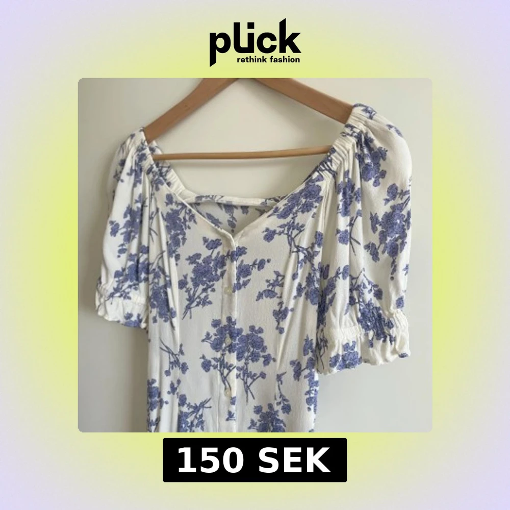 Superfin vit klänning från MNG med blått blommönster. Klänningen har korta puffärmar, knappar framtill och en lätt v-ringad halsringning. Perfekt för sommardagar och har en avslappnad passform.