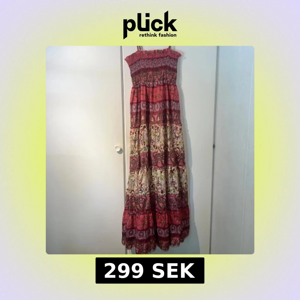 Superfin långklänning i boho-stil med smock upptill och tunna axelband. Klänningen har ett färgstarkt mönster med fjärilar och blommor i vinrött, rosa och beige. Materialet känns lätt och flowy, perfekt för varma dagar. Volangdetaljer och mönstrade bårder ger en unik vibe. Somrig underbart skön! Passar xs-l