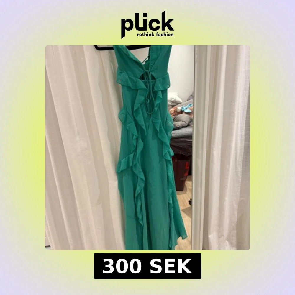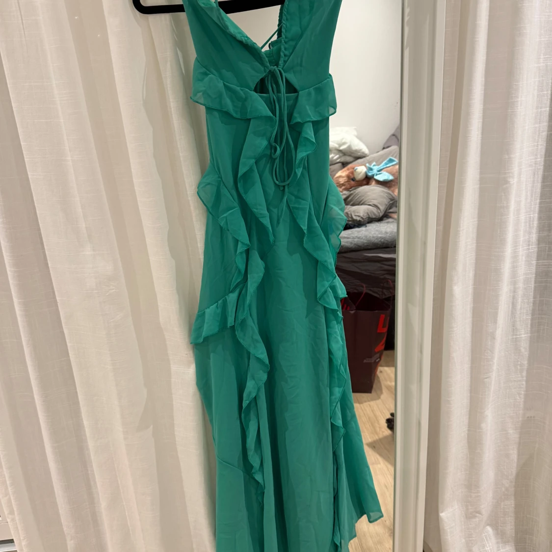 Elegant grön långklänning med volanger och knytning i ryggen. Perfekt för sommarens festligheter. Klänningen har en v-ringad design och är ärmlös, vilket ger en luftig och stilren look.