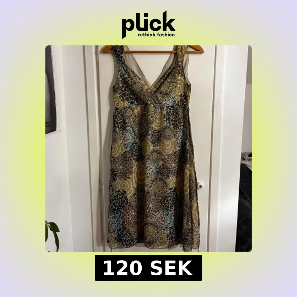 Säljer en unik klänning med ett färgglatt blommönster i beige, blått och brunt. Klänningen har en v-ringad design och knytband i midjan för en justerbar passform. En äldre HM modell som jag köpt på loppis, perfekt för sommaren!!🌸