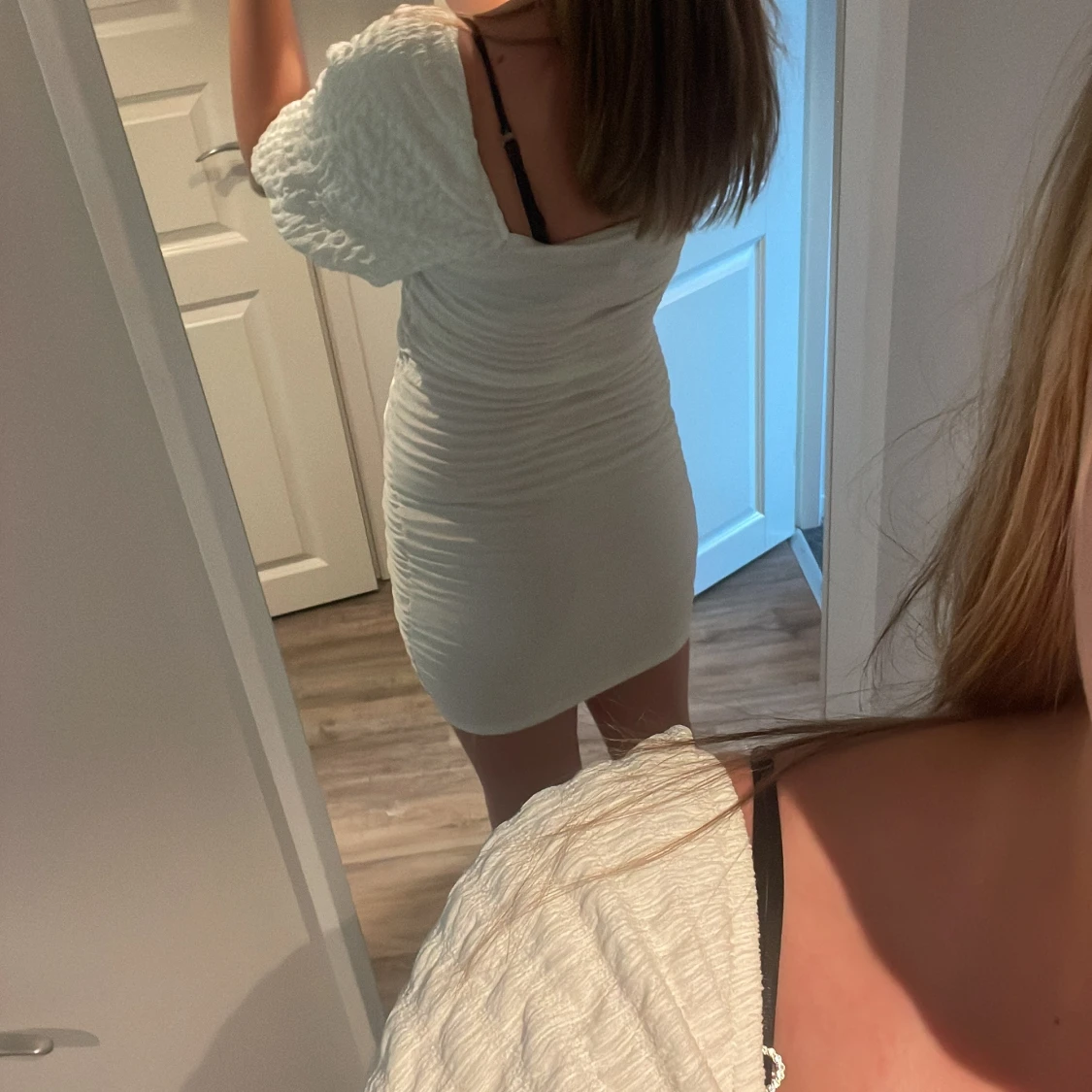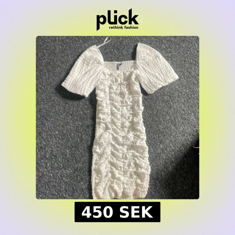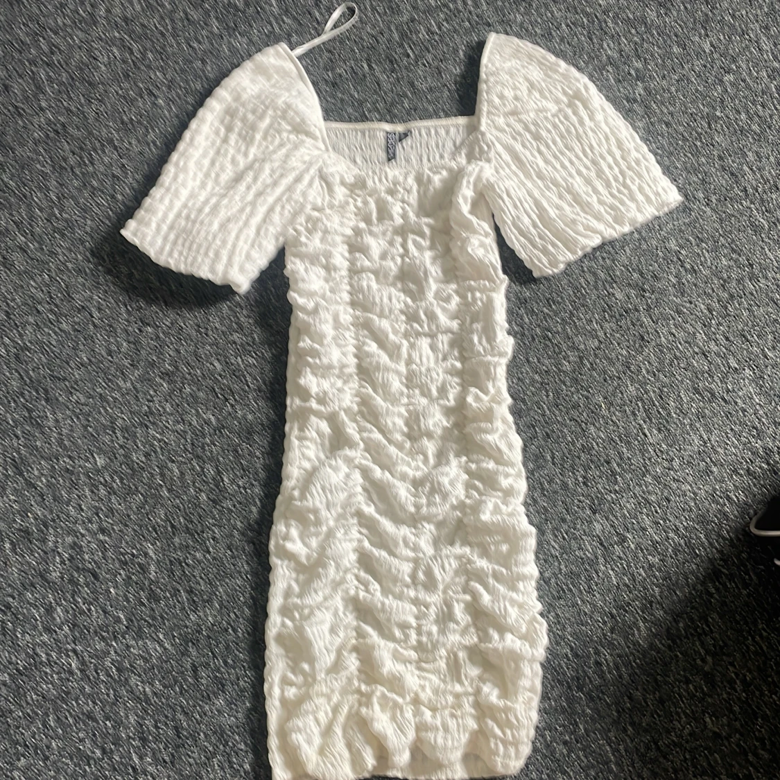 Supersöt vit kort klänning med puffiga kortärmar och smockad struktur. Klänningen har fyrkantig ringning och sitter tight över kroppen. Perfekt för sommarens alla tillfällen och ger en fräsch och trendig look.