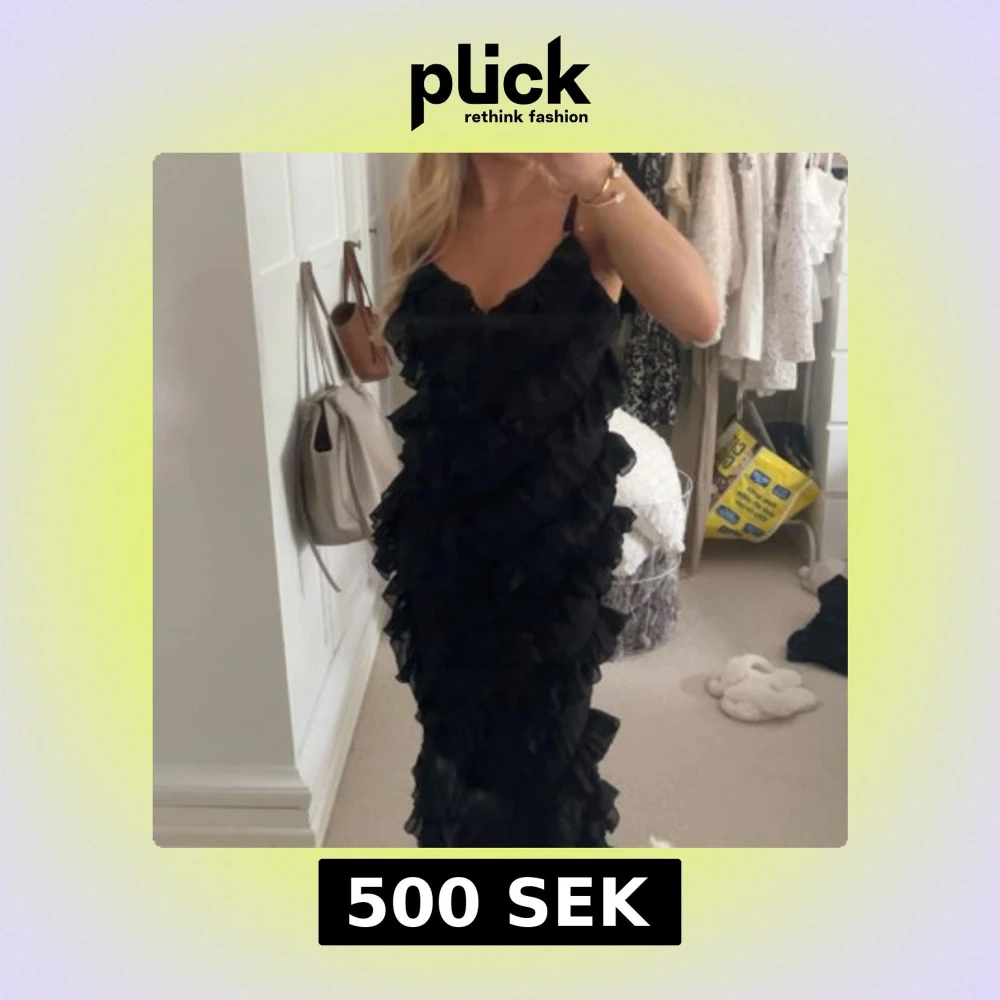 Säljer den här virala svarta långklänningen med volanger från NAKD som är slutsåld. Den är använd en gång så är som ny. Säljer för den inte kommer till användning🥰