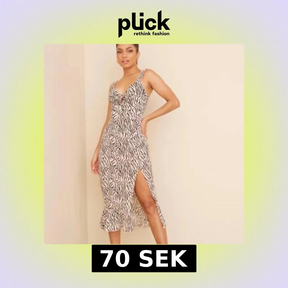 Säljer en snygg zebramönstrad klänning från Nelly. Klänningen har en v-ringad design med smala axelband och en slits framtill. Man kan knyta egen rosett framtill. Oanvänd I storlek 34