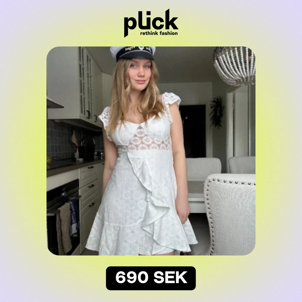 En oanvänd vit studentklänning i stl M med blommönster från Åberg Cøpenhagen. Orginal pris 1000 kr!!Jättefin passform och bekväm (behövs inte ha bh under). Säljer då jag beställde två från samma märke.
