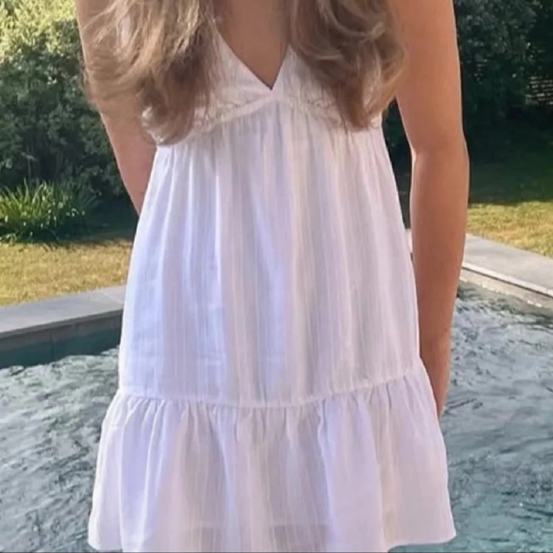 Säljer en söt vit klänning från Pull&Bear i storlek S. Klänningen har en v-ringad design och är ärmlös med en luftig passform. Perfekt för varma sommardagar! 🌞