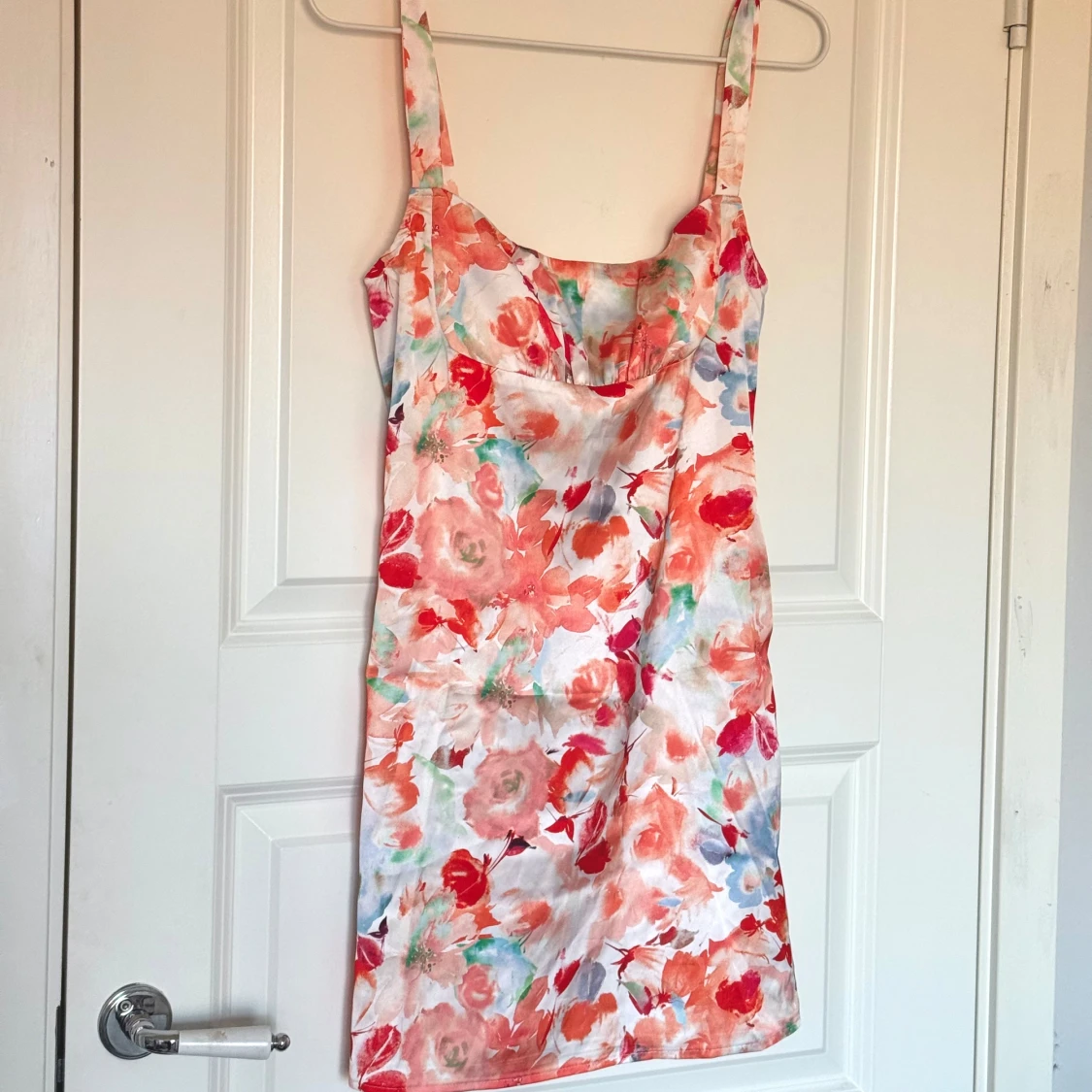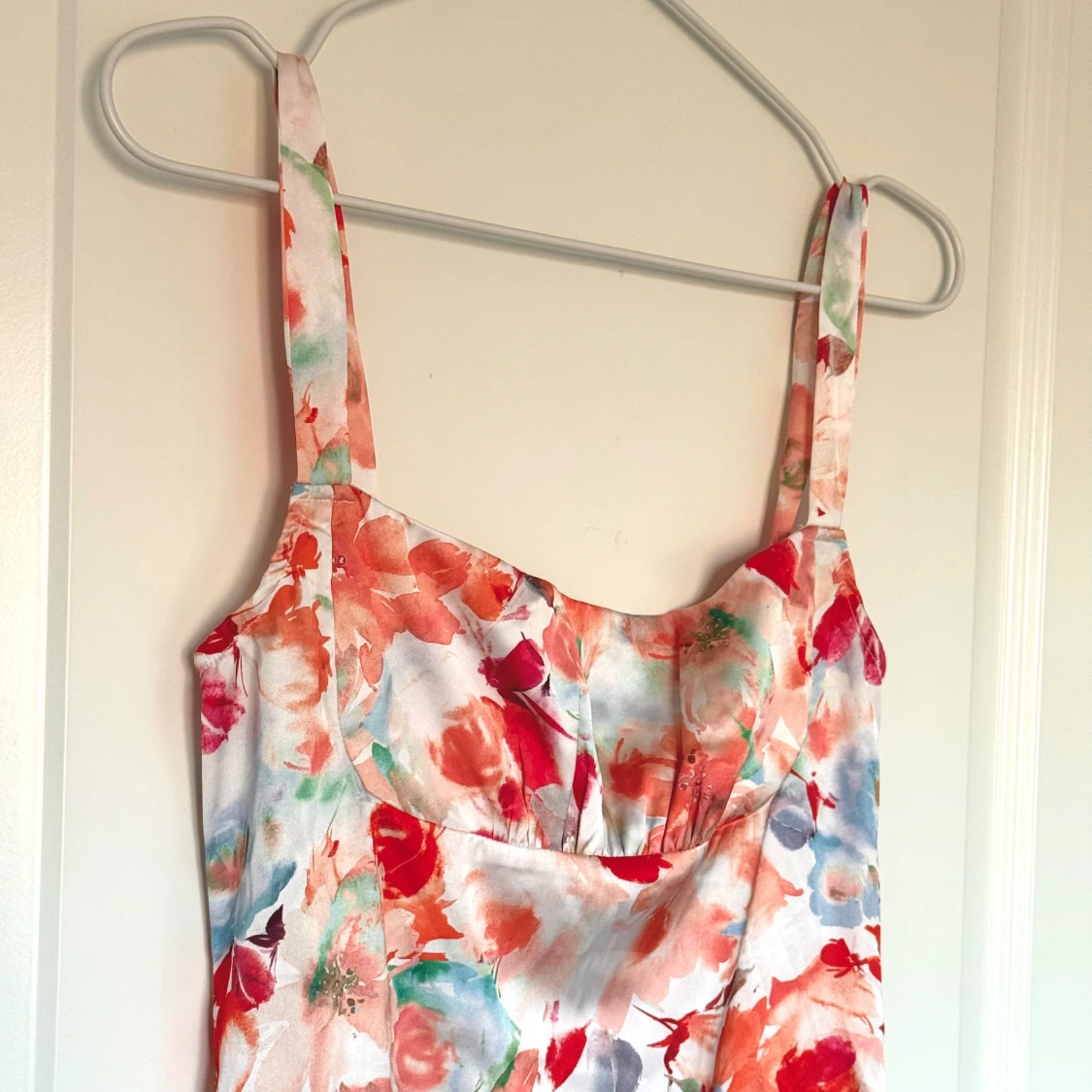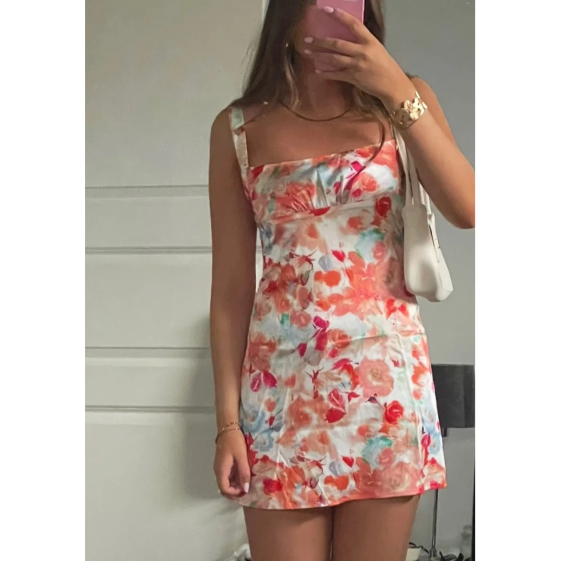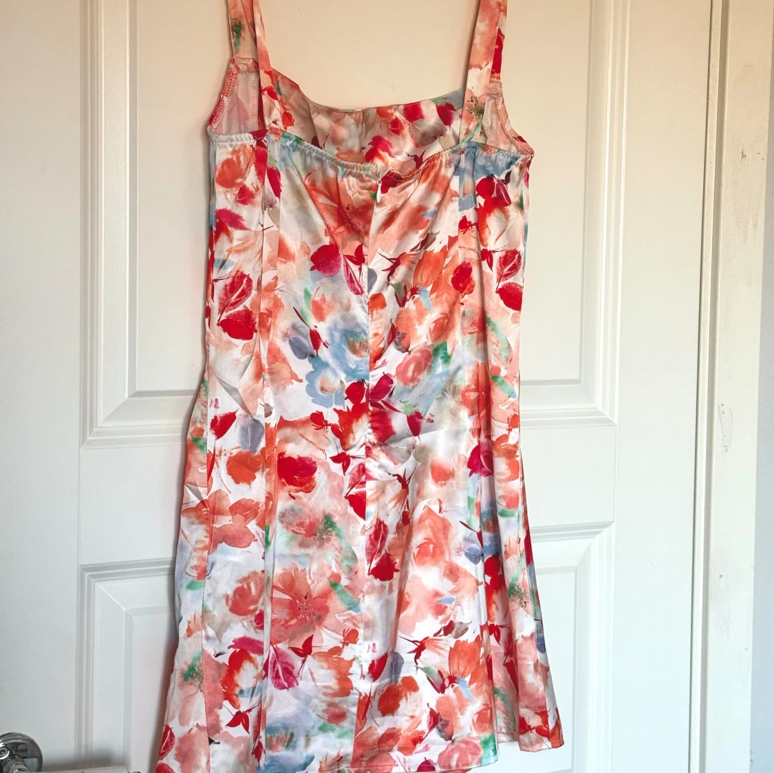 Säljer en färgglad blommig klänning med axelband. Silkesmaterial, dragkedja finns ibak