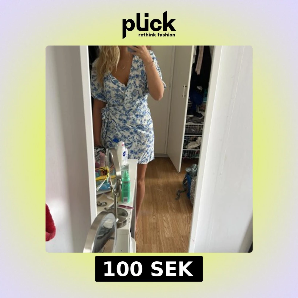 Superfin kort omlottklänning i vitt med blått blommönster. Klänningen har v-ringning, knyt i midjan och korta ärmar. Perfekt för sommarens varma dagar och ger en fräsch och trendig look. OBS! Trasig vid knytet
