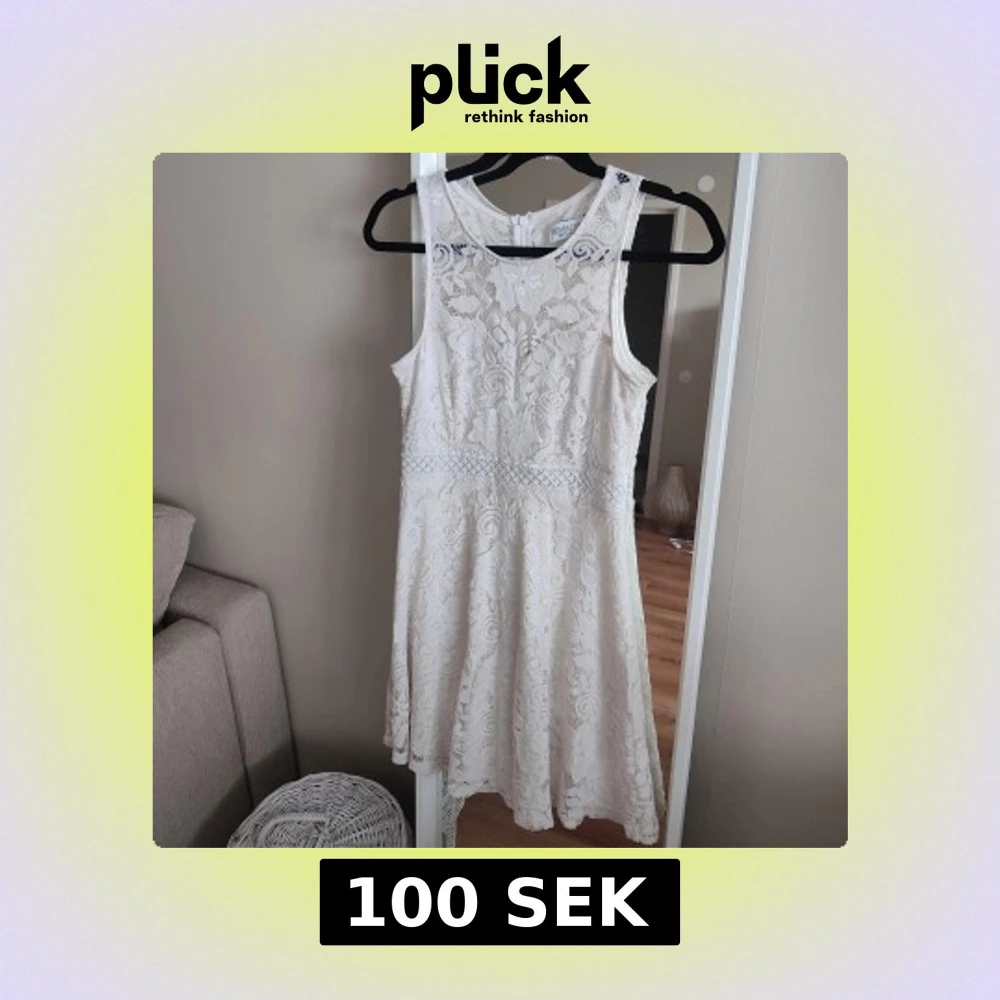 Superfin vit klänning med blommig spets. Perfekt för sommarens tillfällen eller studentfirande. Dragkedja i ryggen för enkel på- och avtagning. Använd en gång, vid min egen student. Det sitter jättebekvämt och fint.