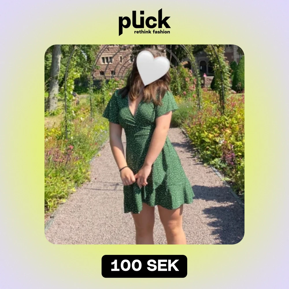 Supersöt grön klänning med vita prickar. Det är en omlottklänning och knyts alltså ihop med ett band som man knyter vid sidan.