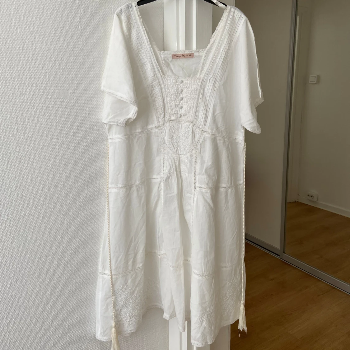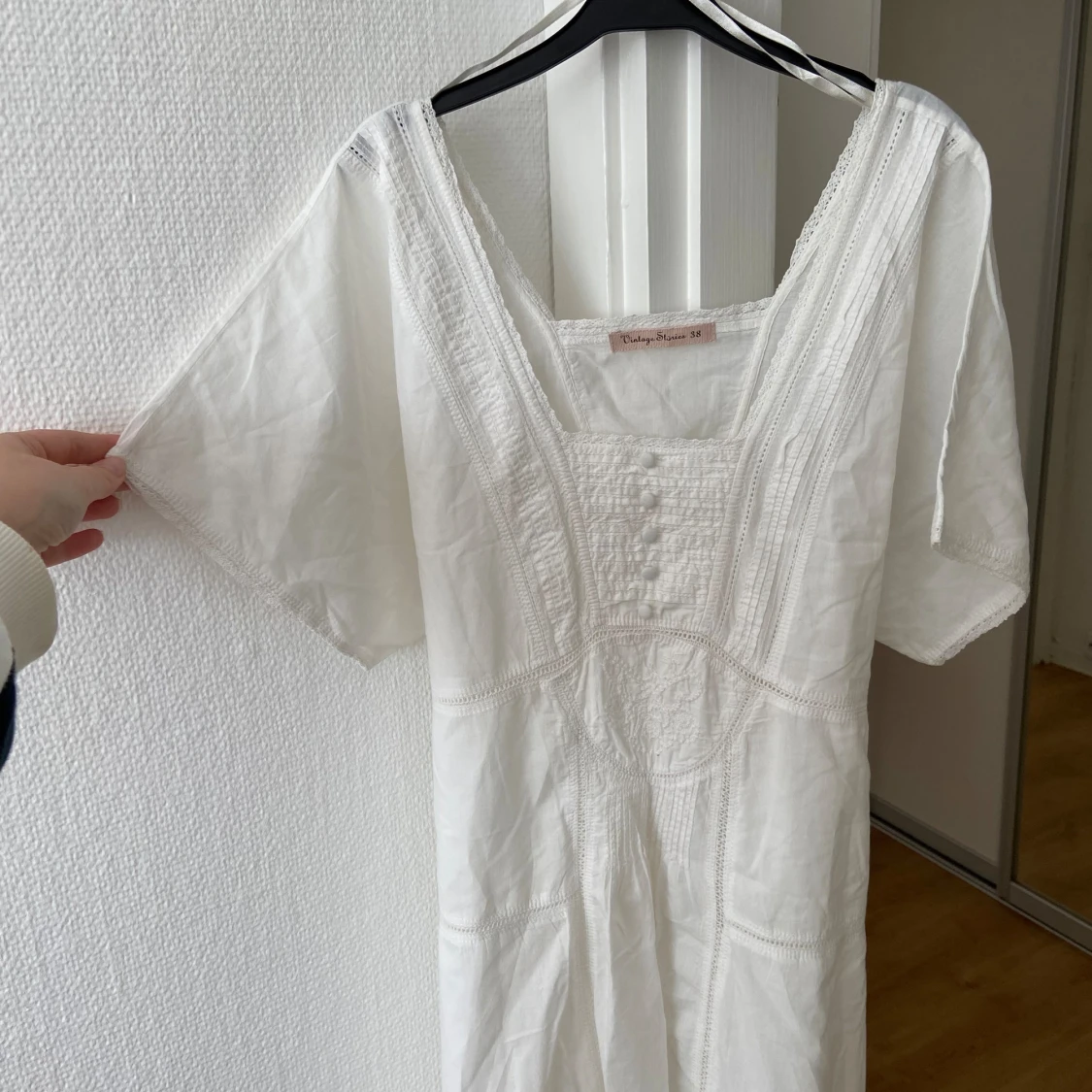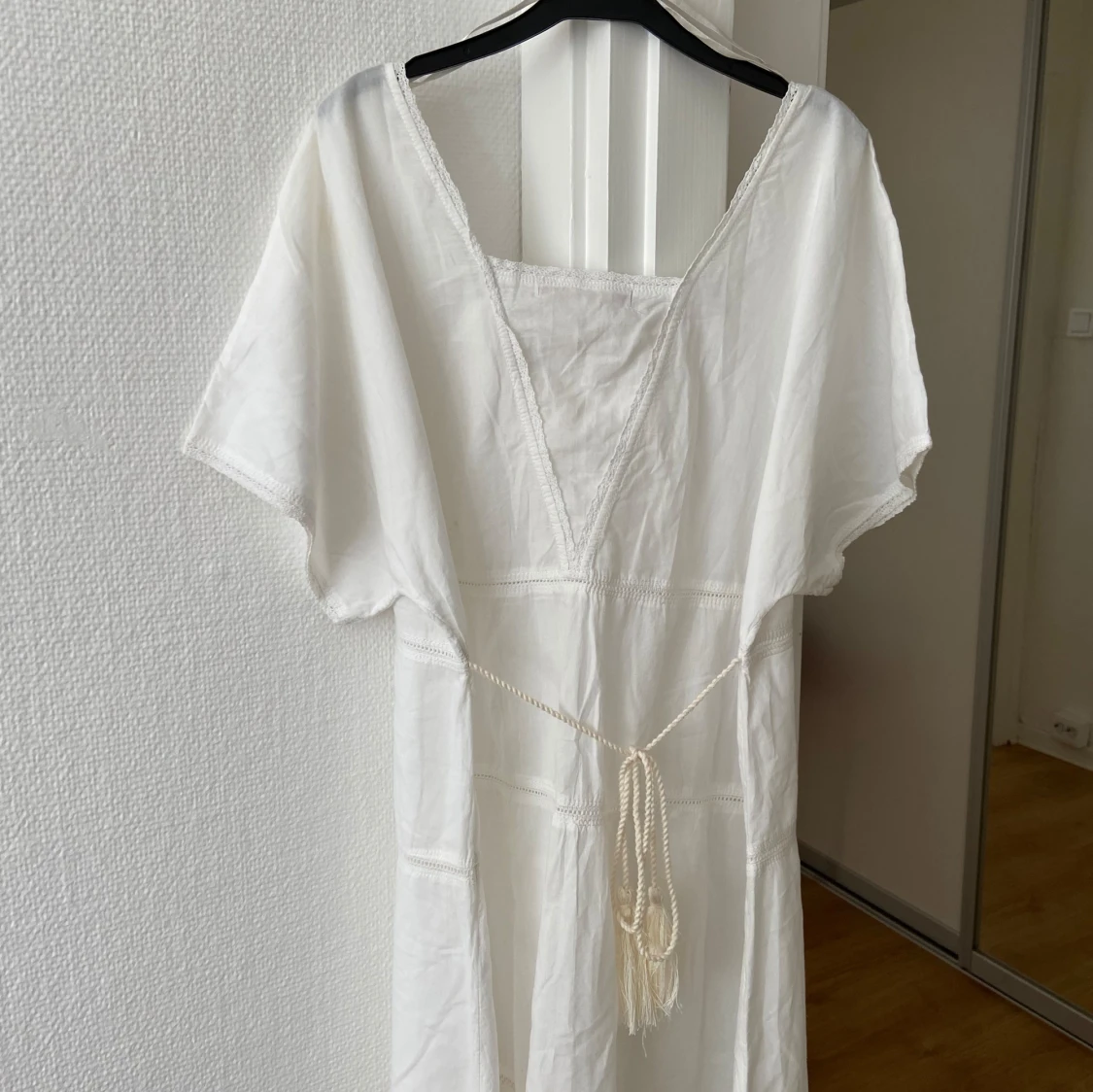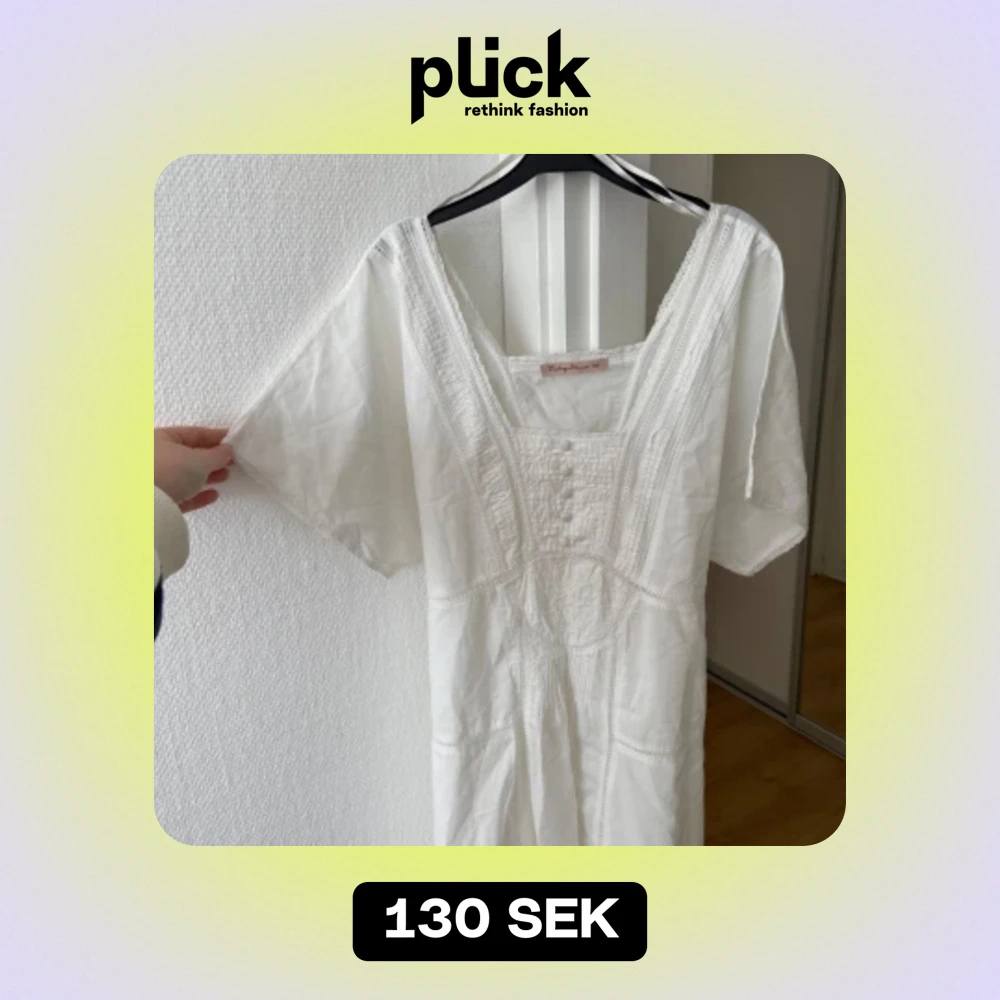 Den perfekta sommarklänningen 😍I vitt med band att knyta i ryggen för en fin passform. Storlek M men passar S och liten L också🌸Har nån vaga fläckar på ryggen, men inget som stör mkt, annars så fint skick! Perfekt med boots eller söta sandaler 🌊☀️🌺