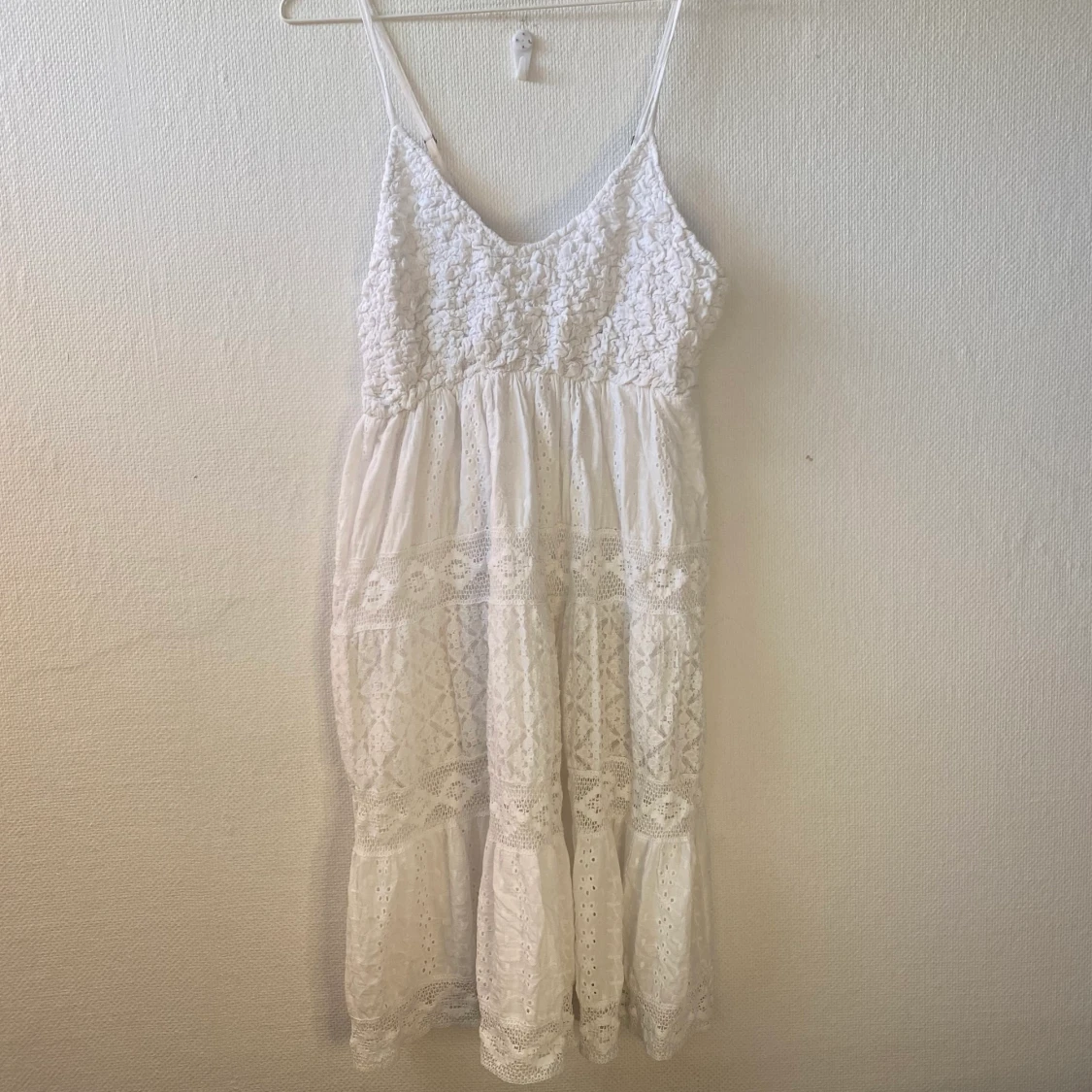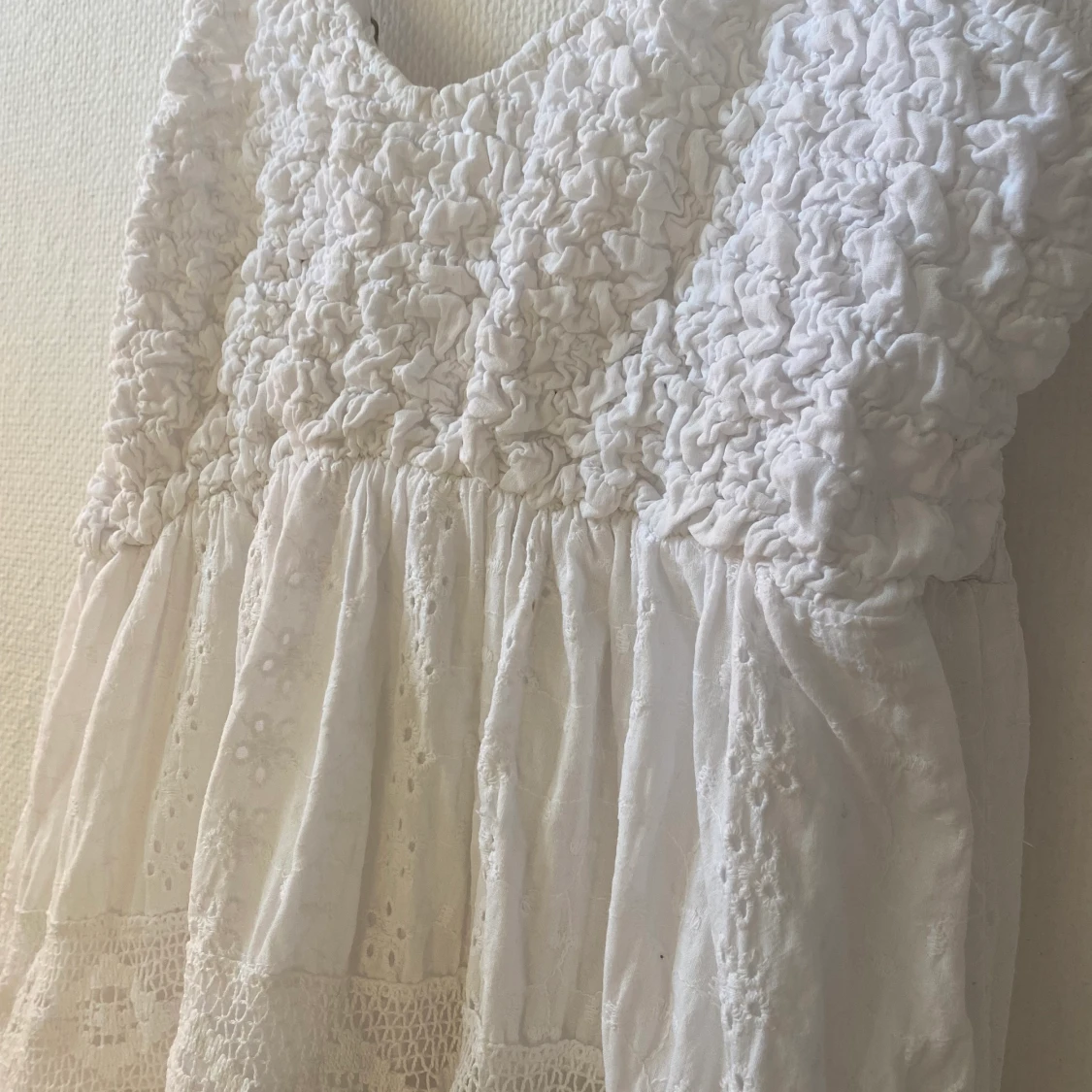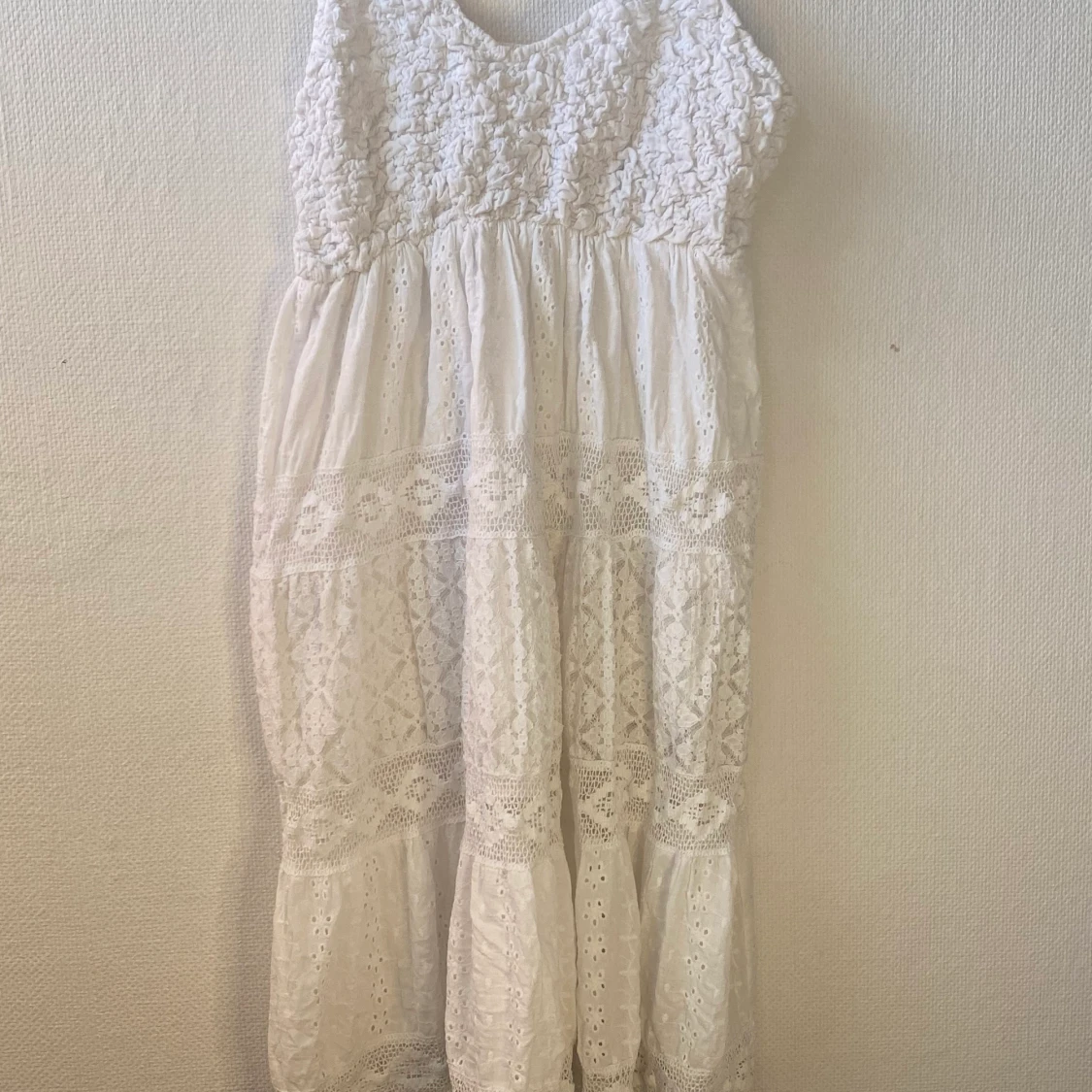 en jättefin vit klänning med olika brodyrer. sval och skön använd en gång💓