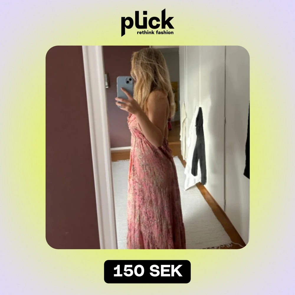 Långklänning, rosa med inslag av grön guld och lila. Så fin till solsemestern till middag eller stranden. Köpte den i Palma, använd 2 gånger. Det är one size men jag har oftast storlek s