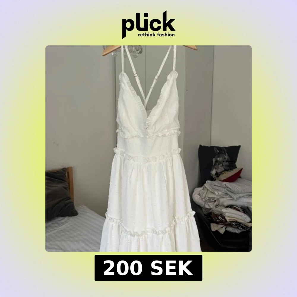 Fin vit klänning med gulligt mönster, passar bra till studenten eller sommaren 🌸 Har en liten fläck vid ena bröstet men annars fint skick