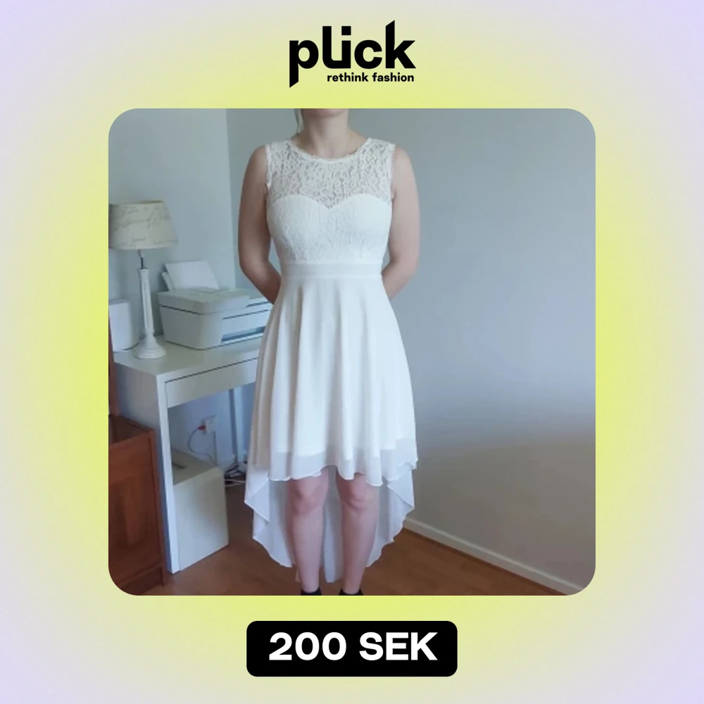 Fin vit klänning i storlek S med dragkedja bak och knytband. I skick som ny, använd en gång. Spets: 60% nylon, 40% bomull Foder: 100% polyester Underdel: 100% polyester Tvättas i 40° med avigsidan ut.