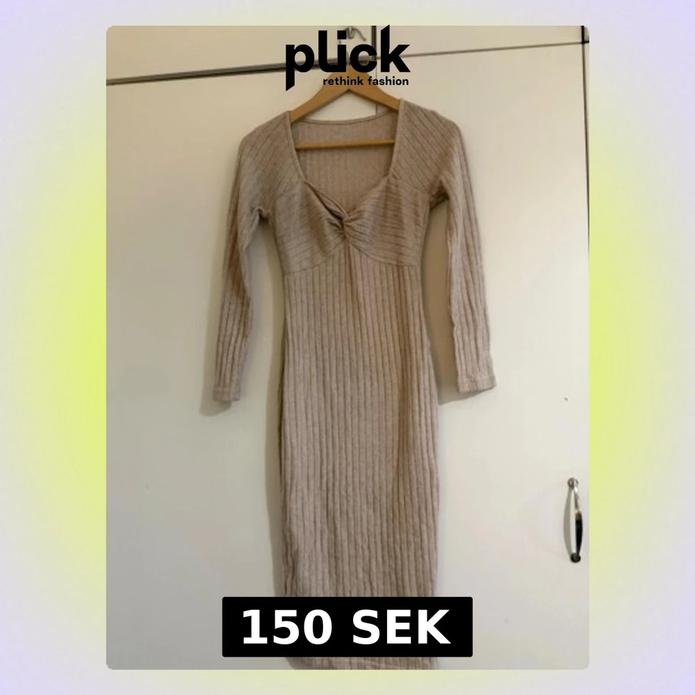 Beige ribbad långklänning med lång ärm och v-ringad halsringning med twistdetalj framtill. Klänningen har en kroppsnära passform och är tillverkad i ett stickat material som känns mjukt och följsamt.